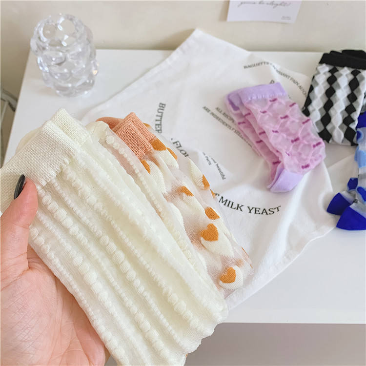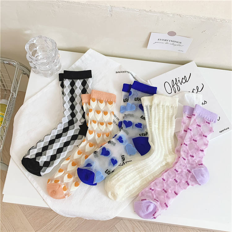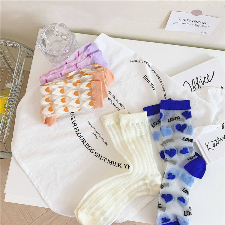 Primavera y verano nuevos calcetines de encaje amor japonés rayas verticales Cass calcetines de tubo medio para mujer Klein azul transparente Soc para mujer