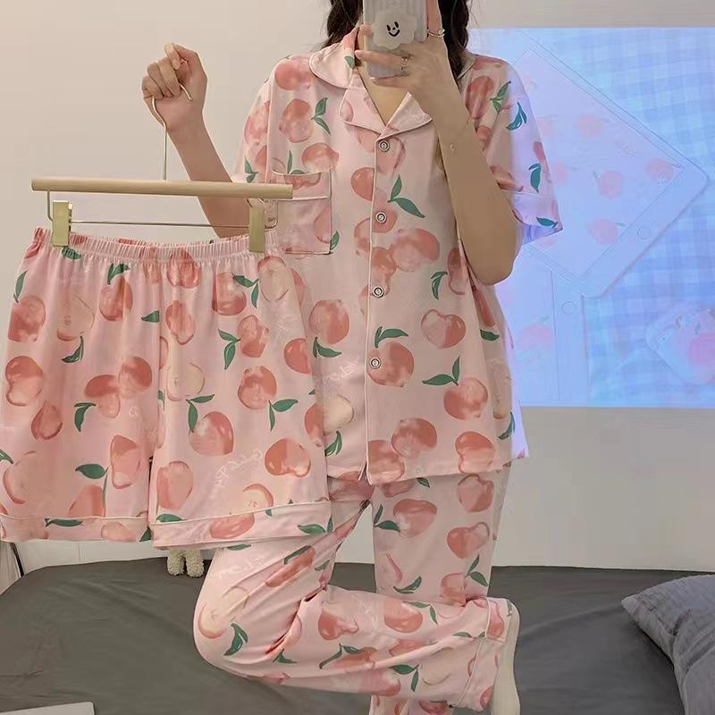 Primavera y verano nuevo cárdigan de tres piezas pijamas de manga corta para mujer primavera y otoño fino lindo dibujos animados verano ropa de casa