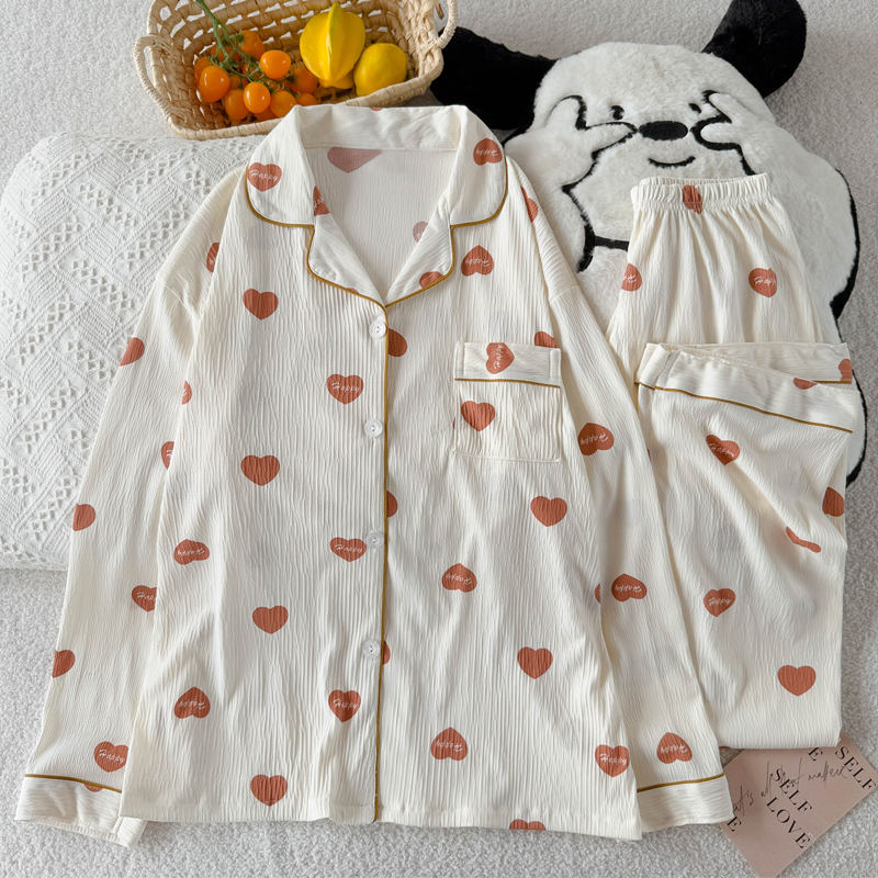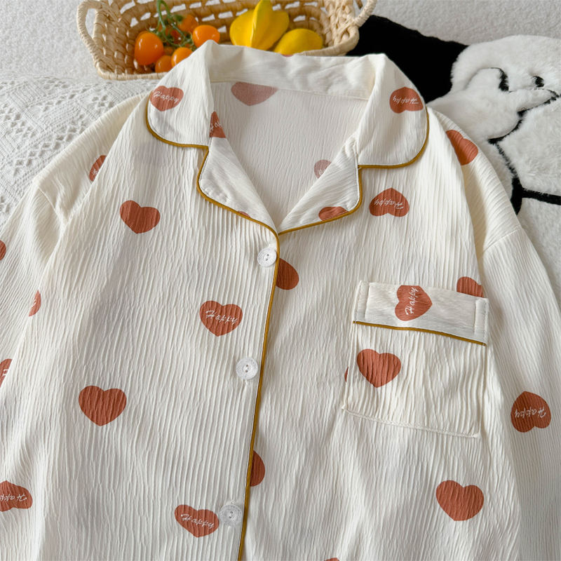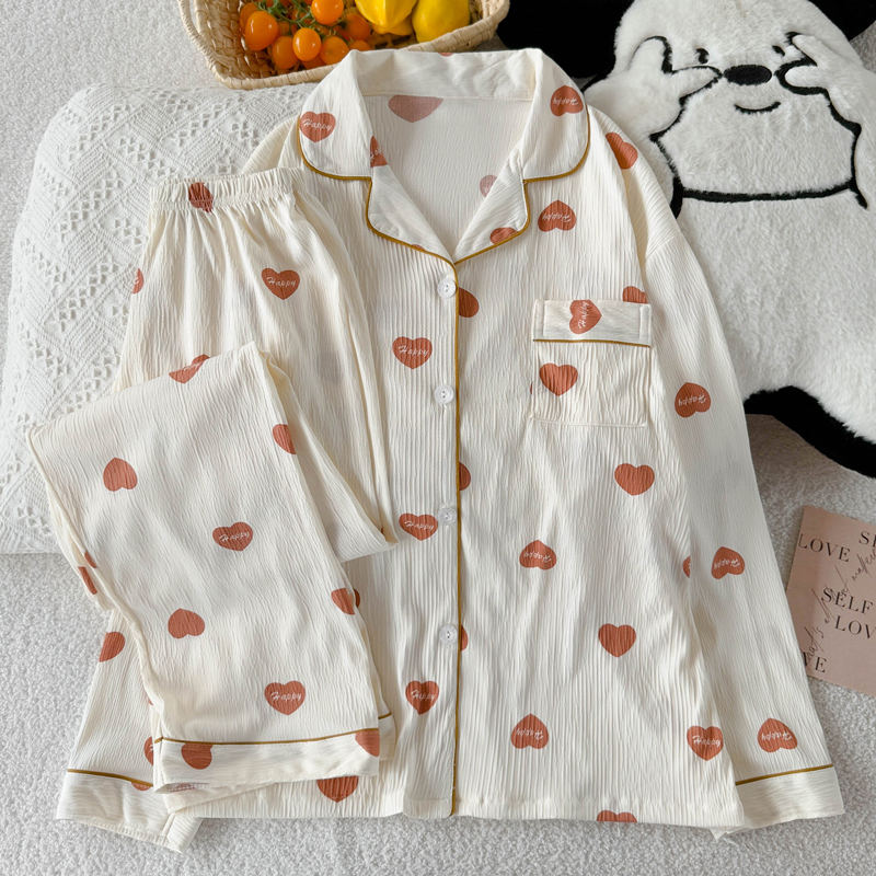 Novedad Primavera/Verano: Conjunto de Ropa de Dormir para Mujer con Estampado de Corazones, Manga Larga, Tela Ligera y Arrugada