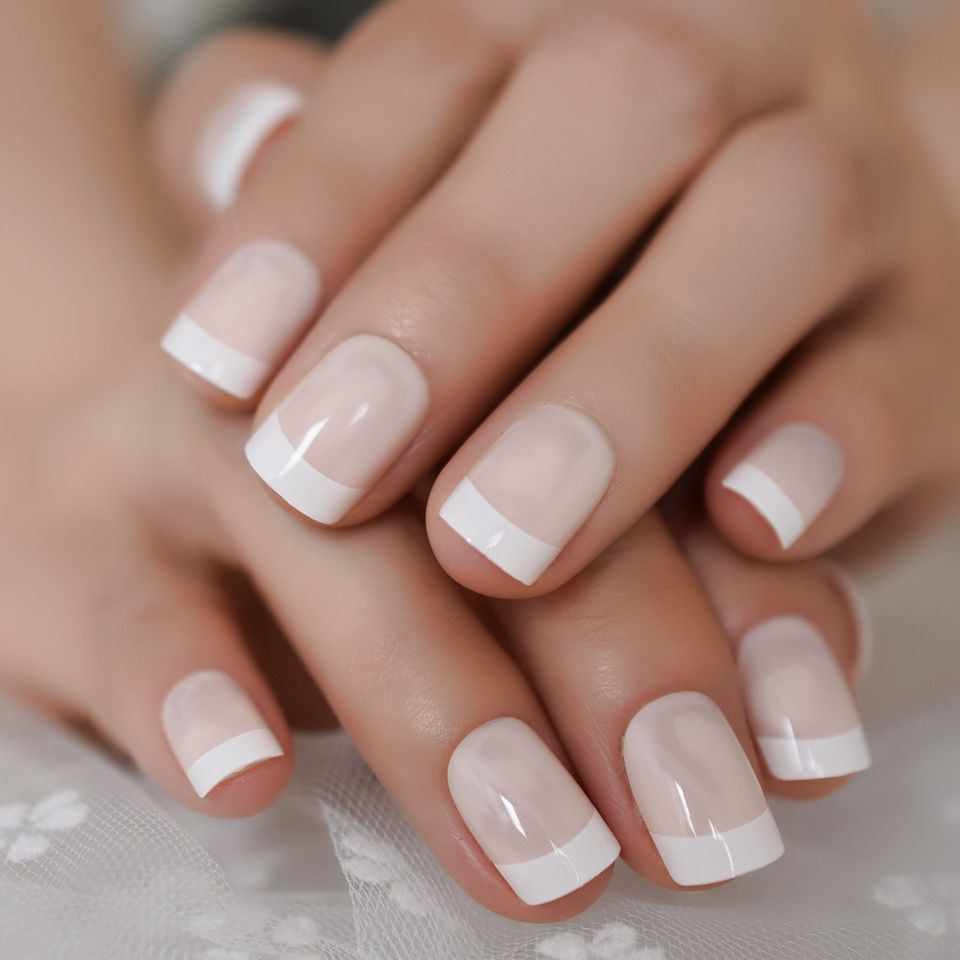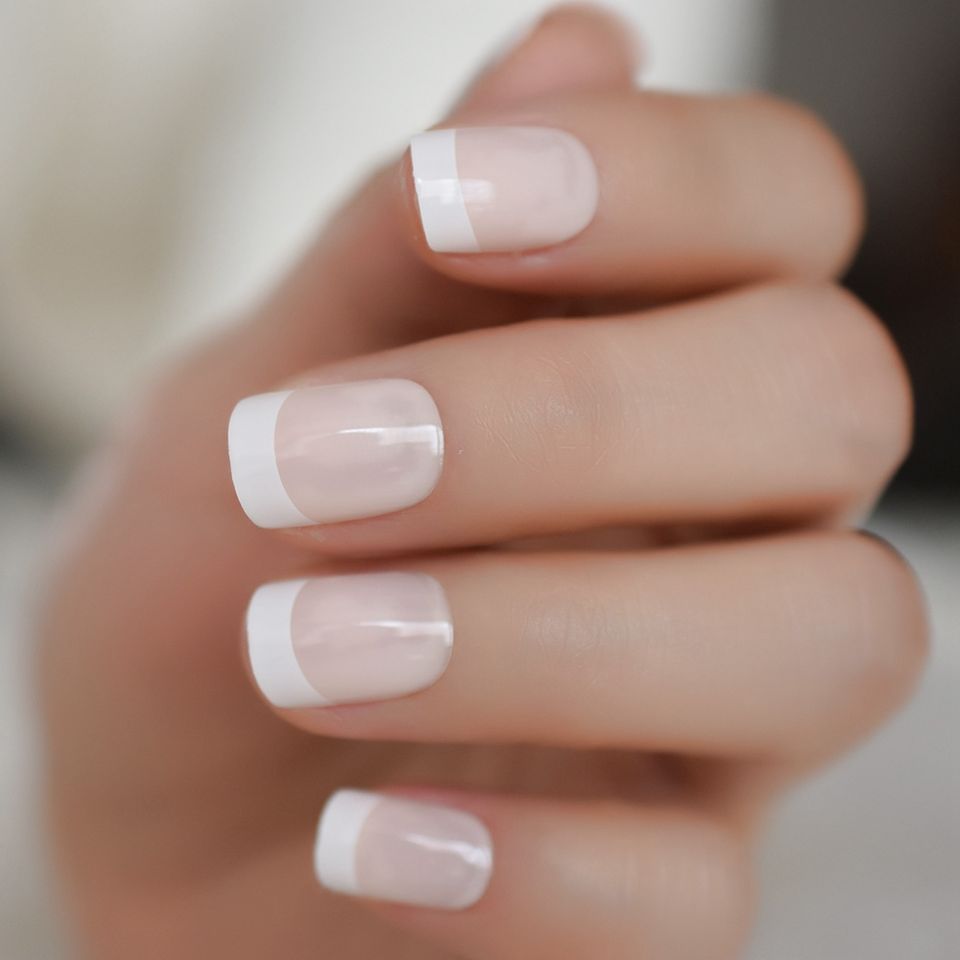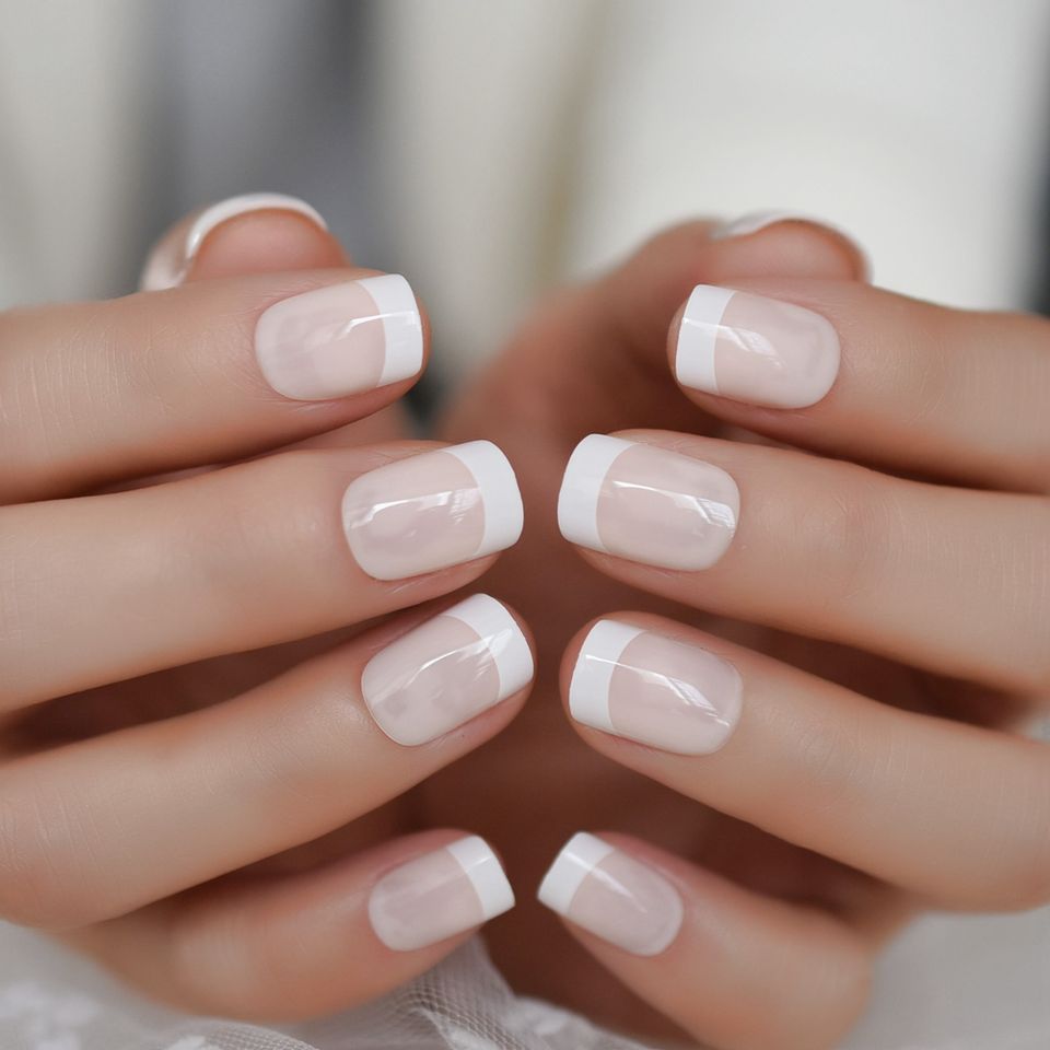 Puntas de uñas acrílicas ABS francesas cuadradas, uñas desnudas a presión con puntas francesas, cortas brillantes para mujeres y niñas