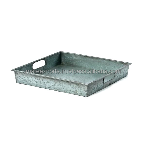 Bandeja para servir de metal galvanizado cuadrado hecho a mano elegante con asas duraderas al por mayor para servir alimentos