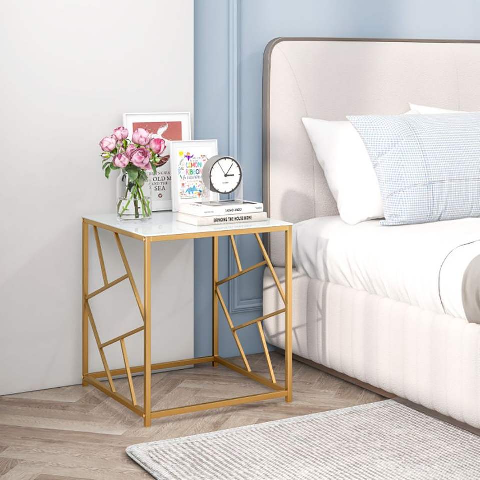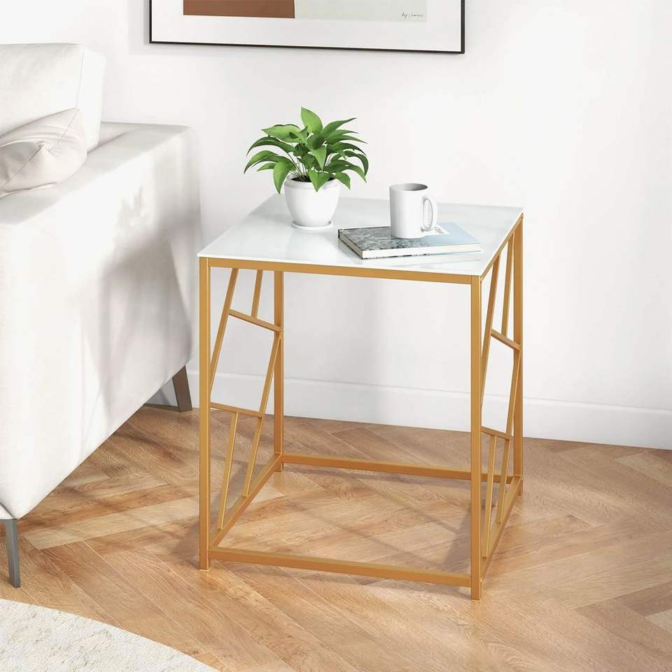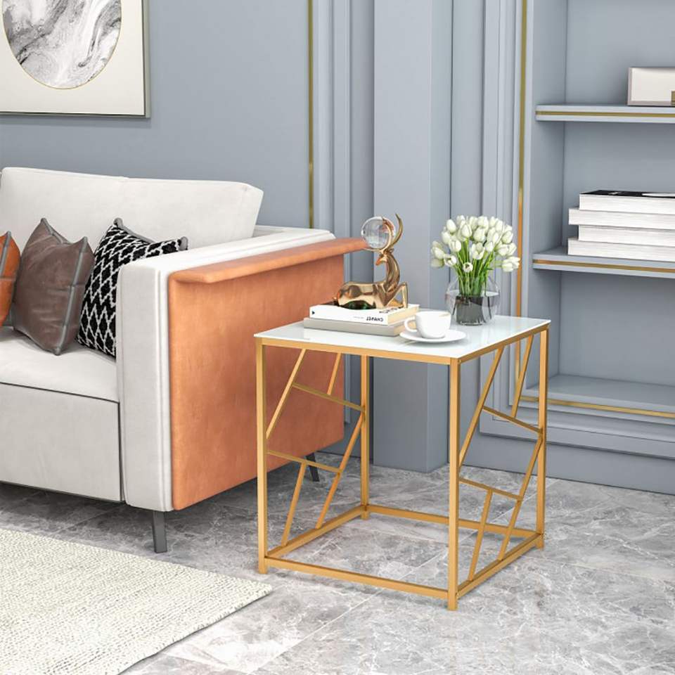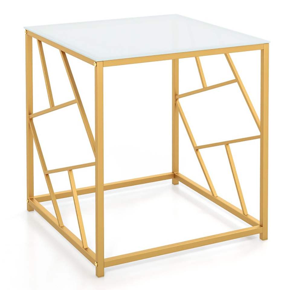 Mesa Auxiliar Cuadrada con Acabado Dorado y Tapa de Vidrio Templado, Diseño Geométrico para Mesas de Centro
