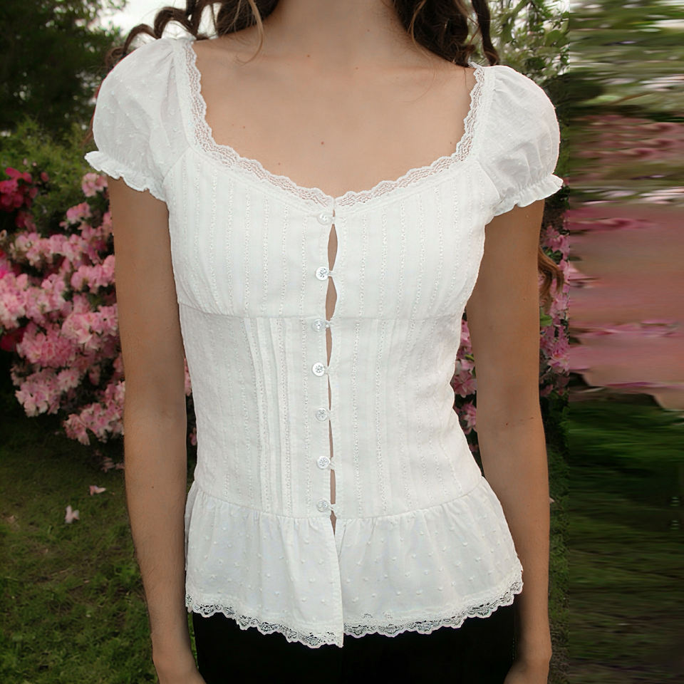 Camiseta de Manga Corta con Cuello Cuadrado, Botones al Frente, Cintura Plizada y Ajustada, Top Corto con Encaje Francés