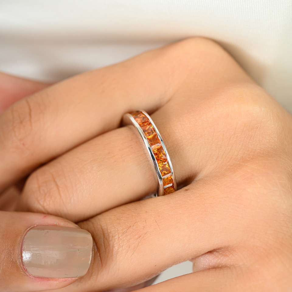 Forma cuadrada hecha a mano Real naranja zafiro media eternidad banda anillo piedra natal joyería fabrica nuevos productos de moda impresionante