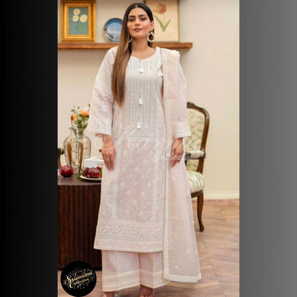 Vestido bordado de la colección Ssumaira, trabajo de hilo bordado pesado, pantalones con estampado Digital Floral Dupatta Khadi y farshi shalwar