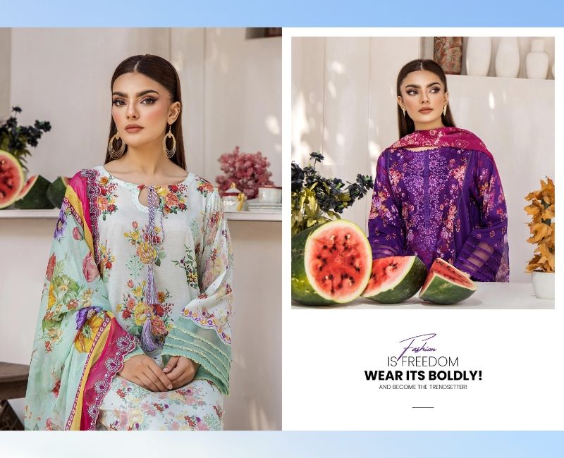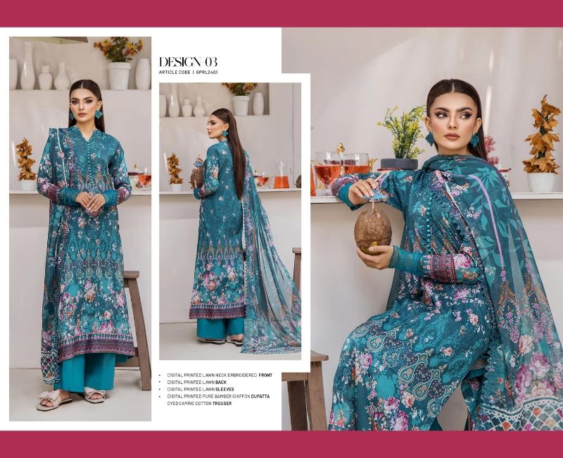 Ssumaira Collection's Pearly 3 piezas impreso césped bordado vestido Emb cuello Daman Cutwork Dupatta puro Cambric algodón indio