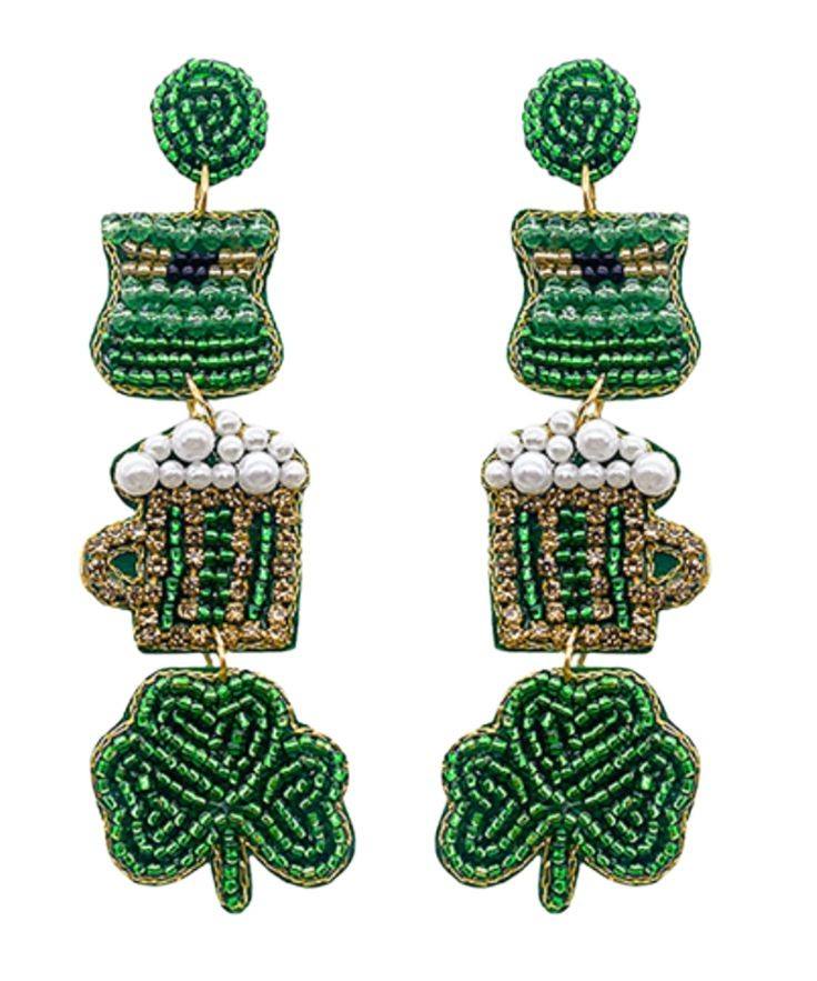 Pendientes Huggie de estilo clásico del día de San Patricio, trébol de cuatro hojas bordado, trébol verde, cuentas de semillas de la suerte, espalda de fieltro