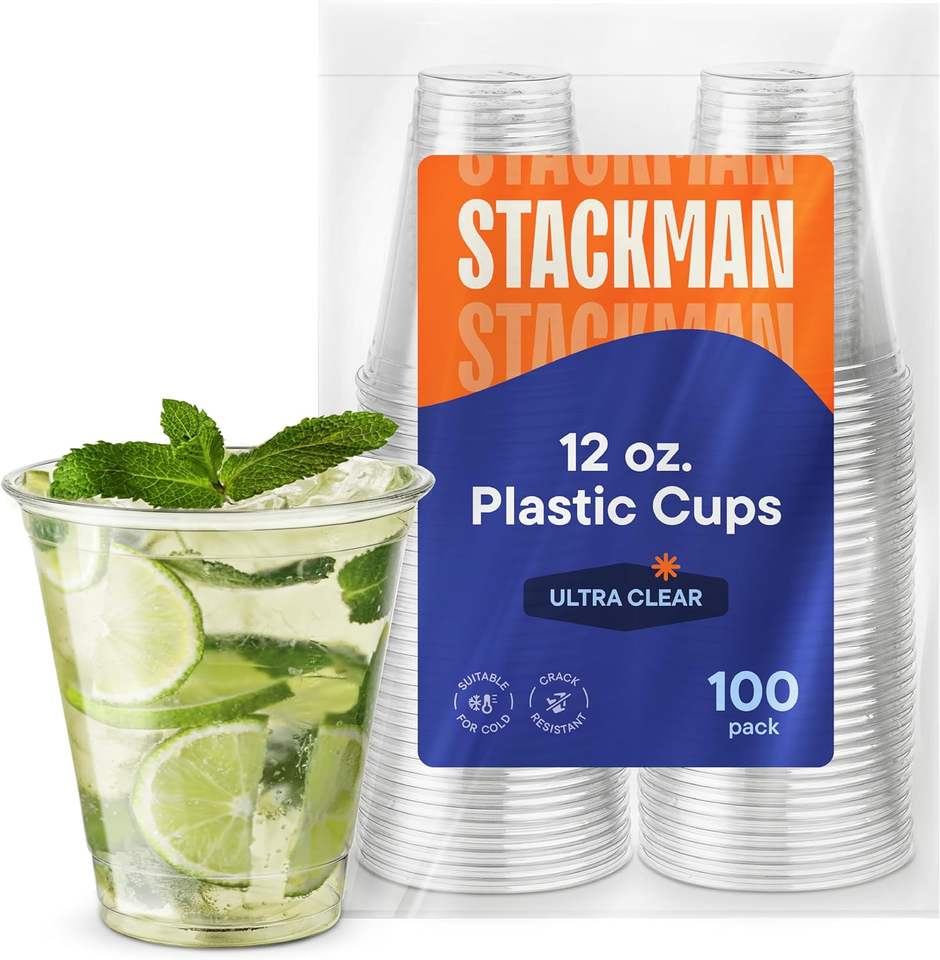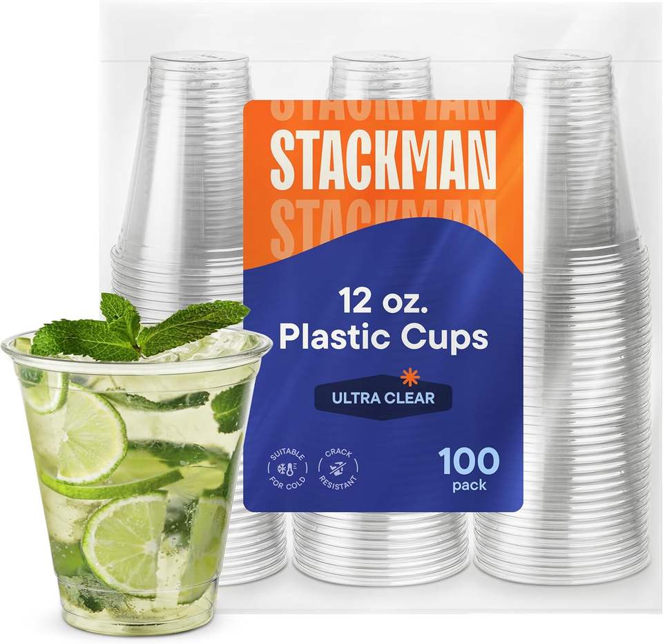 Stack Man [Paquete de 100 - 12 oz.] Vasos Desechables Transparentes de Plástico PET, Vasos Desechables Transparentes de 12 oz