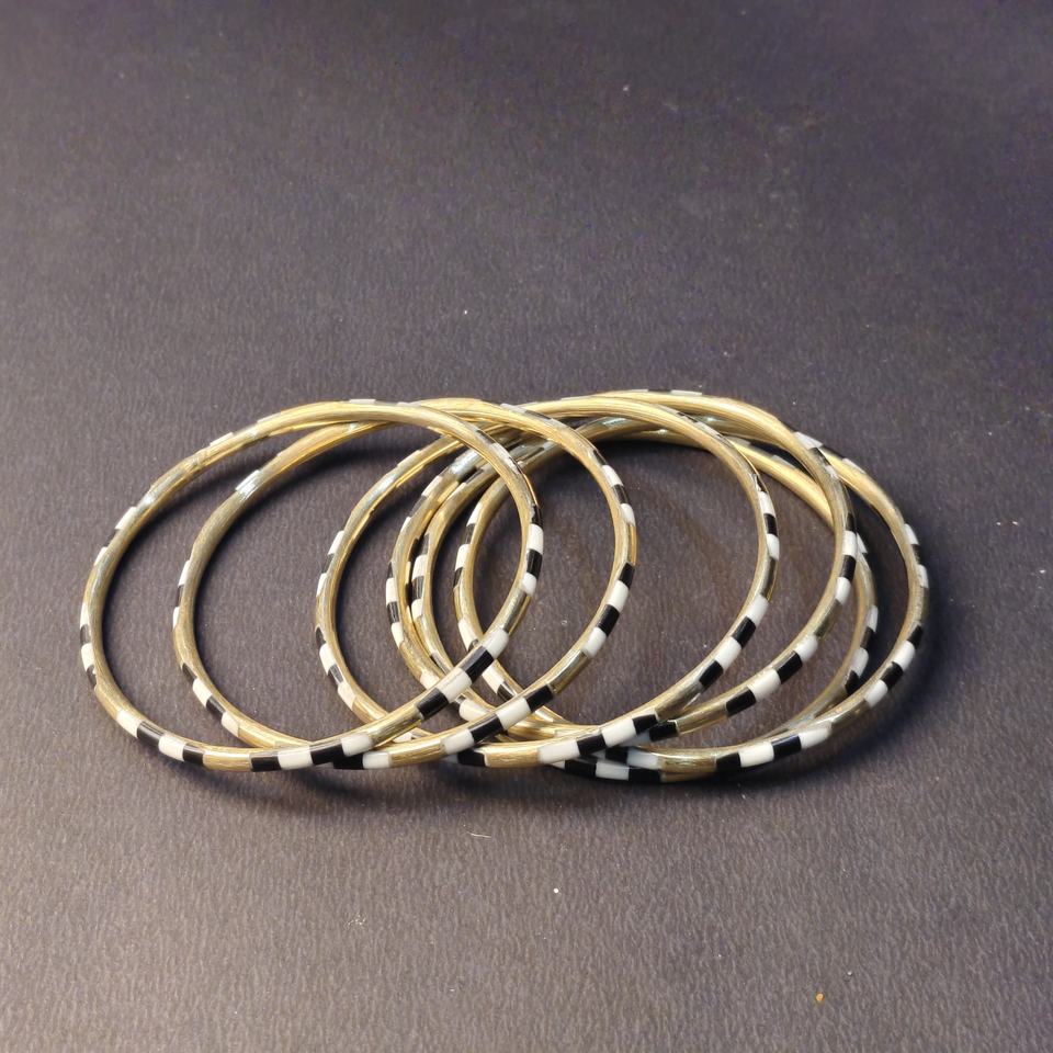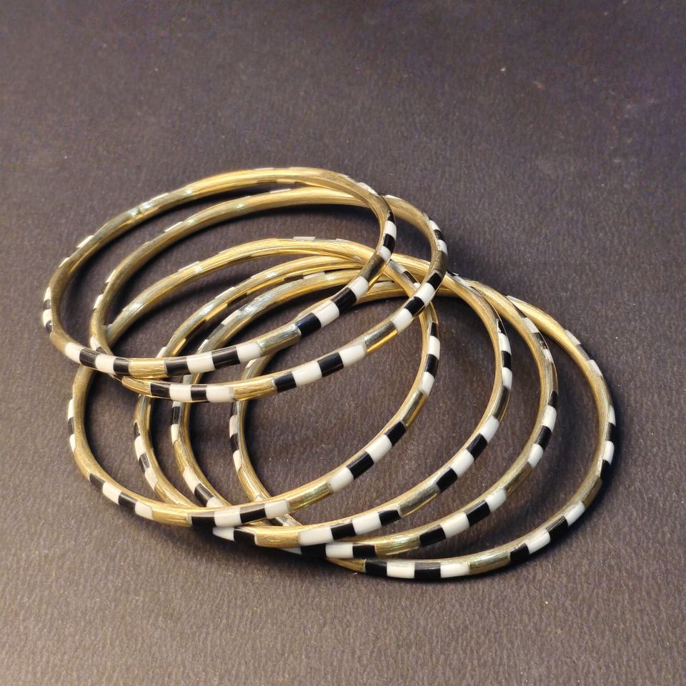 Juego de 6 Brazaletes Apilables de Latón Fino con Patrón a Cuadros de Esmalte Blanco y Negro - Joyería de Muñeca Metálica con Diseño Gráfico Moderno