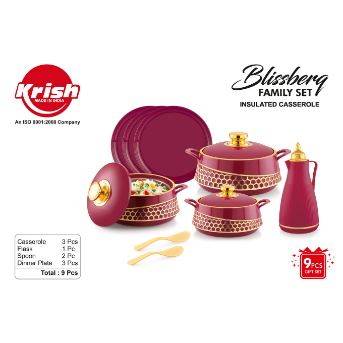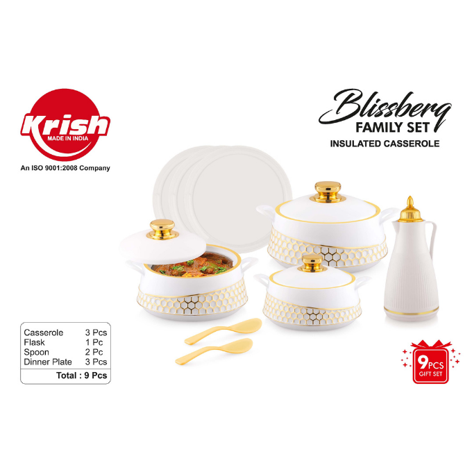 Contenido-9 PCs:Cazuelas-3 PC, frasco-1 PC, cuchara-2 PC, placa de cena-3 placas