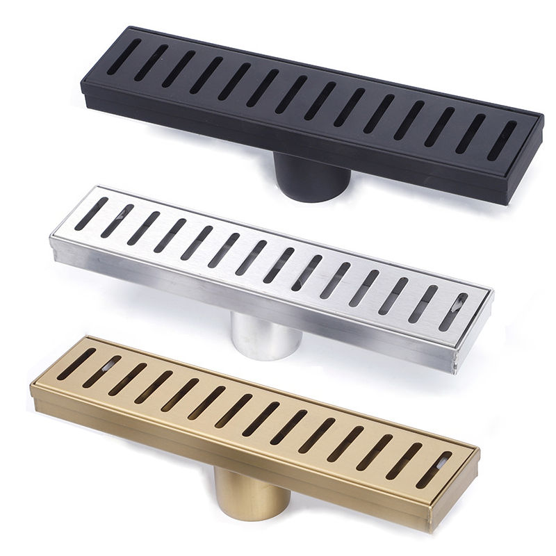 Rejilla de drenaje de suelo rectangular de acero inoxidable 304 antiobstrucción con descarga lateral extendida de alto flujo para baño, acabado mate