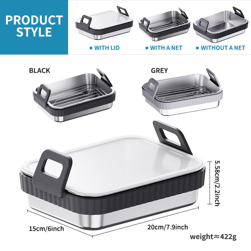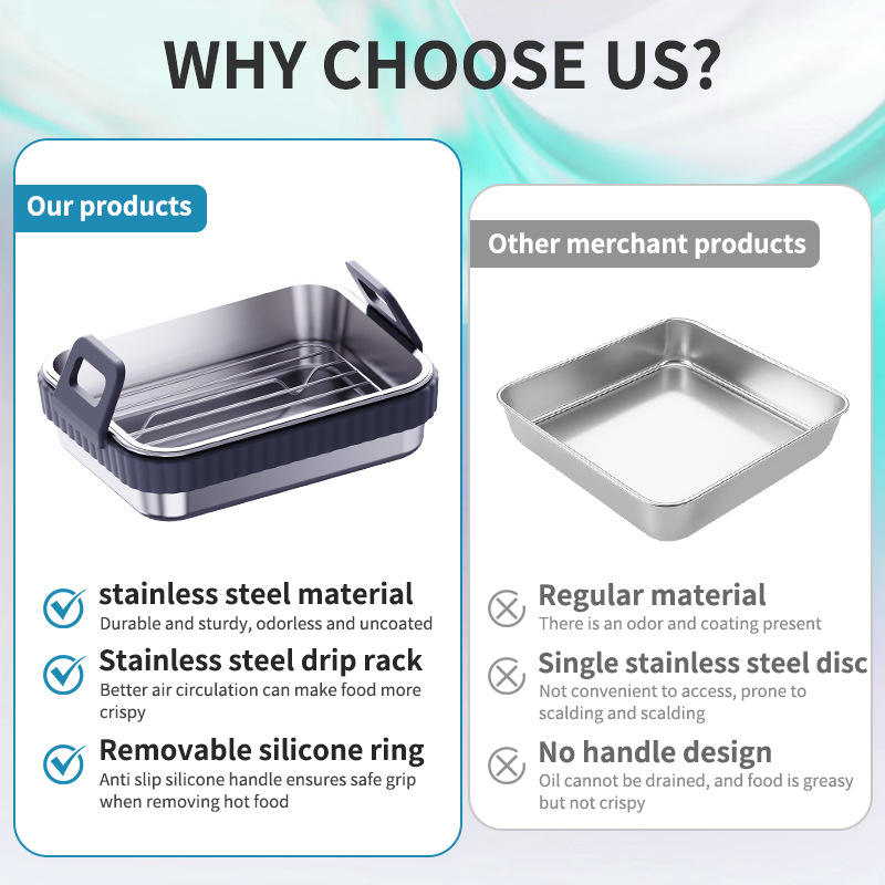 Bandeja de horno de acero inoxidable para freidora de aire, rectangular, apta para lavavajillas, con asa de silicona de grado alimenticio, tapa y rejilla, multiusos