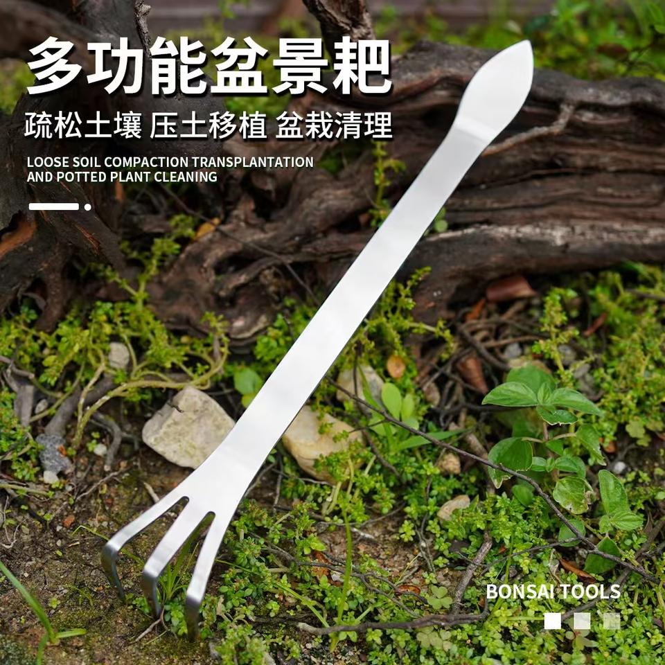 Rastrillo para bonsái de acero inoxidable, herramienta de 3 puntas para aflojar y compactar el suelo, para jardinería y cuidado de plantas en macetas