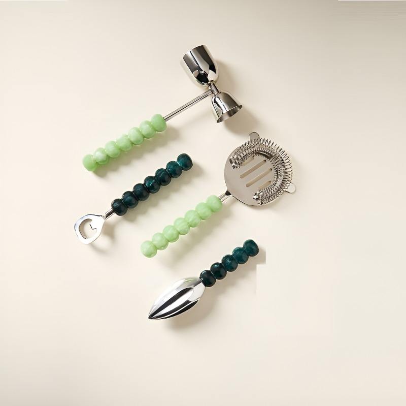 Juego completo de herramientas de bar de acero inoxidable con mango de cuentas de resina verde claro y verde oscuro, juego de barra de mesa con soporte
