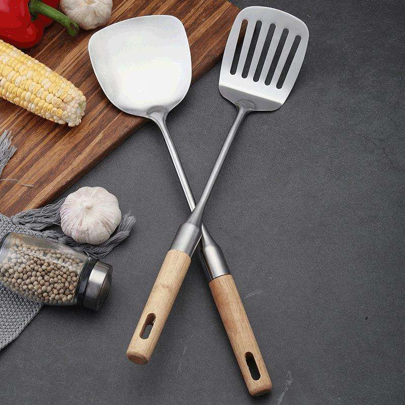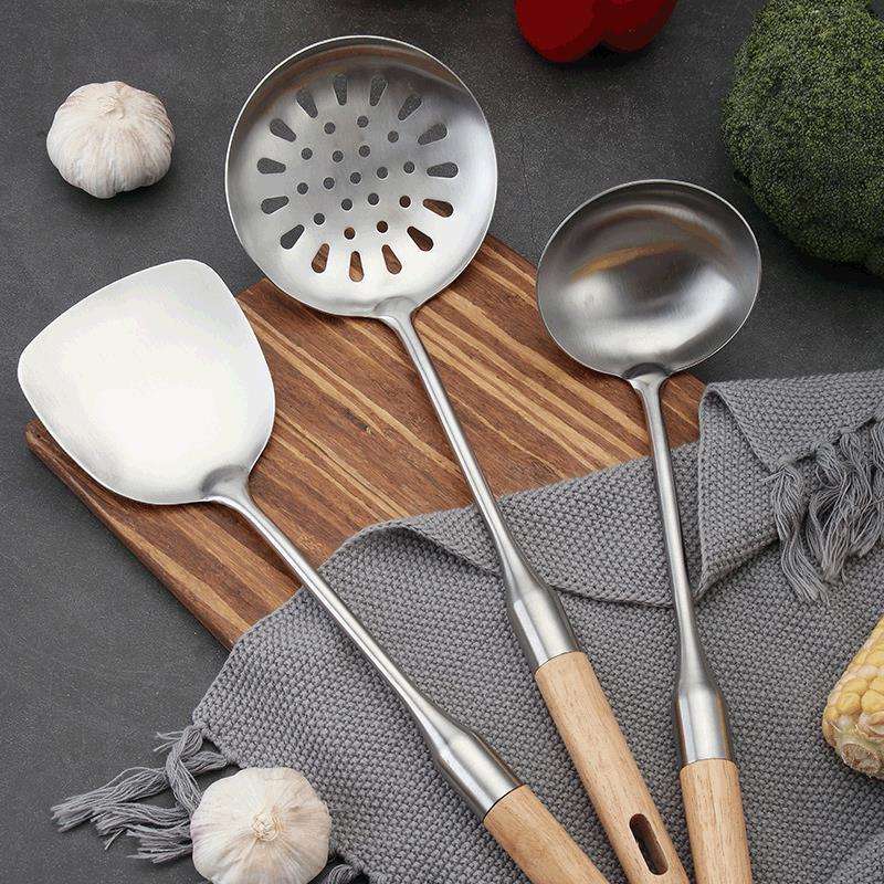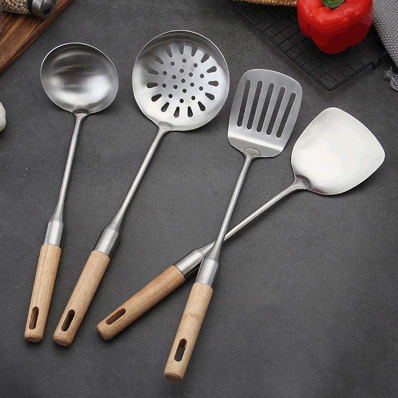 Juego de utensilios de cocina de acero inoxidable, 4 piezas, espátula resistente al calor con mango de madera, cuchara para uso en la cocina