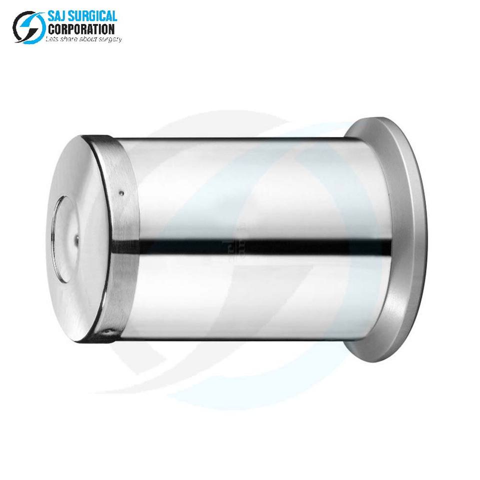 Dispensador manual de acero inoxidable con tapa abatible para almacenamiento de algodón metílico y gasa en entornos de Farmacia y laboratorio