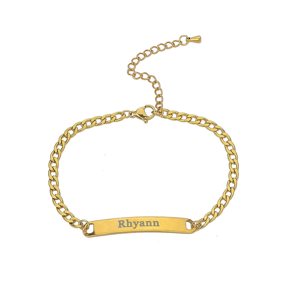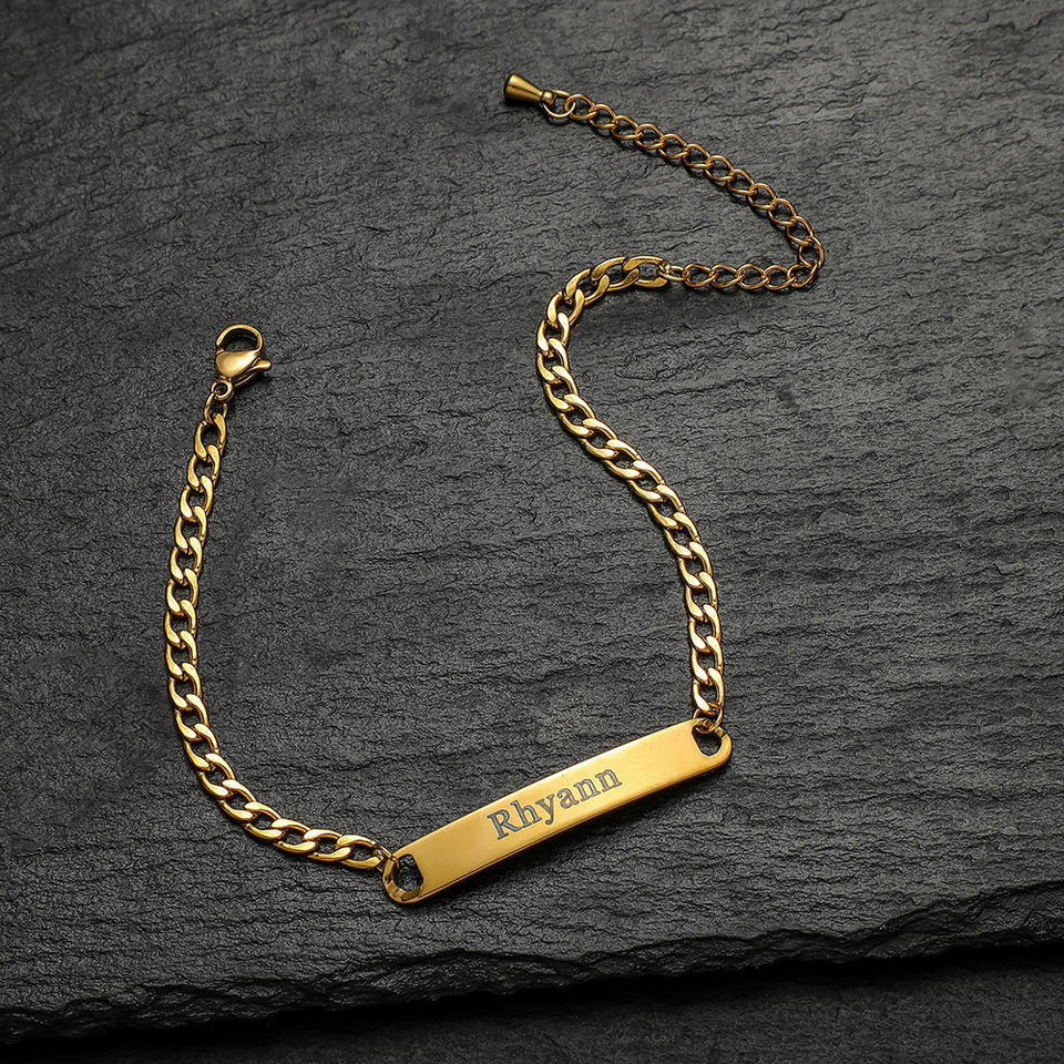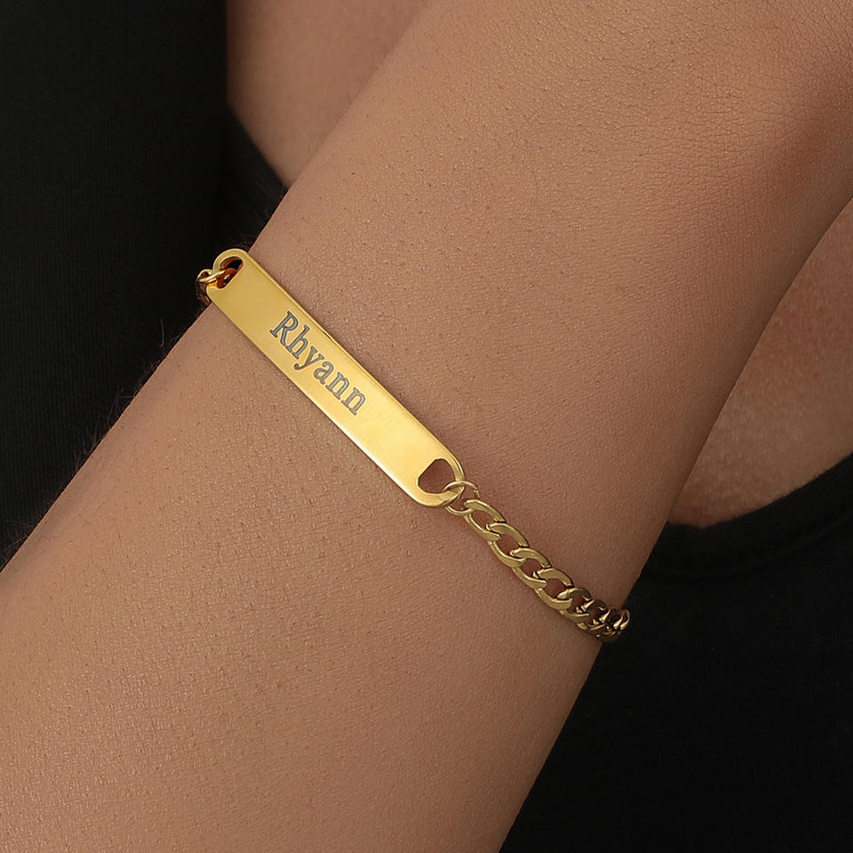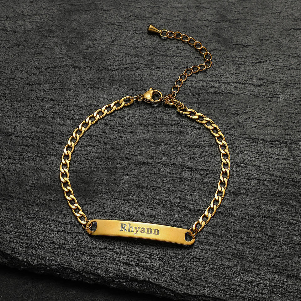 Pulsera de acero inoxidable con placa de nombre grabada para hombre y mujer, pulsera de cadena cubana de acero y titanio