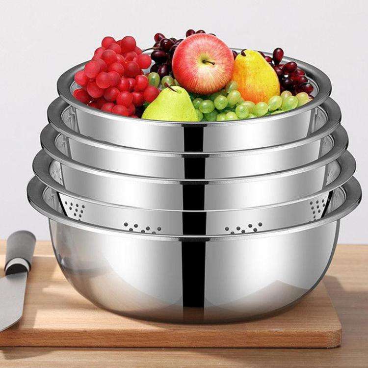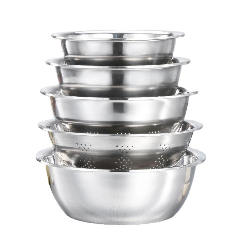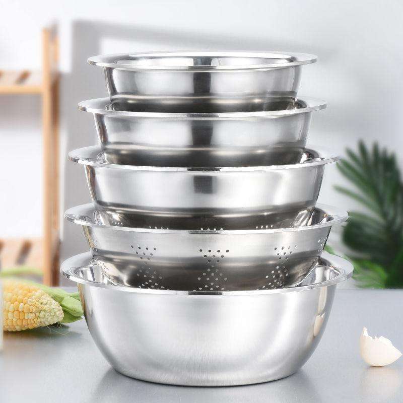 Juego de cinco tazones redondos profundos de acero inoxidable, apilables, para mezclar en la cocina, para sopa, masa, verduras y drenaje.