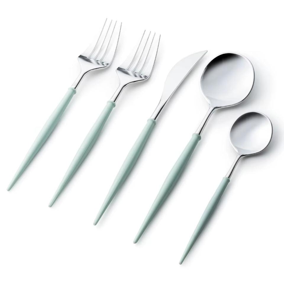 Cubiertos de acero inoxidable usados en utensilios de cocina Tabletop Cafe Home Cubiertos chapados en color plateado Juego de 5 con Mango Verde largo