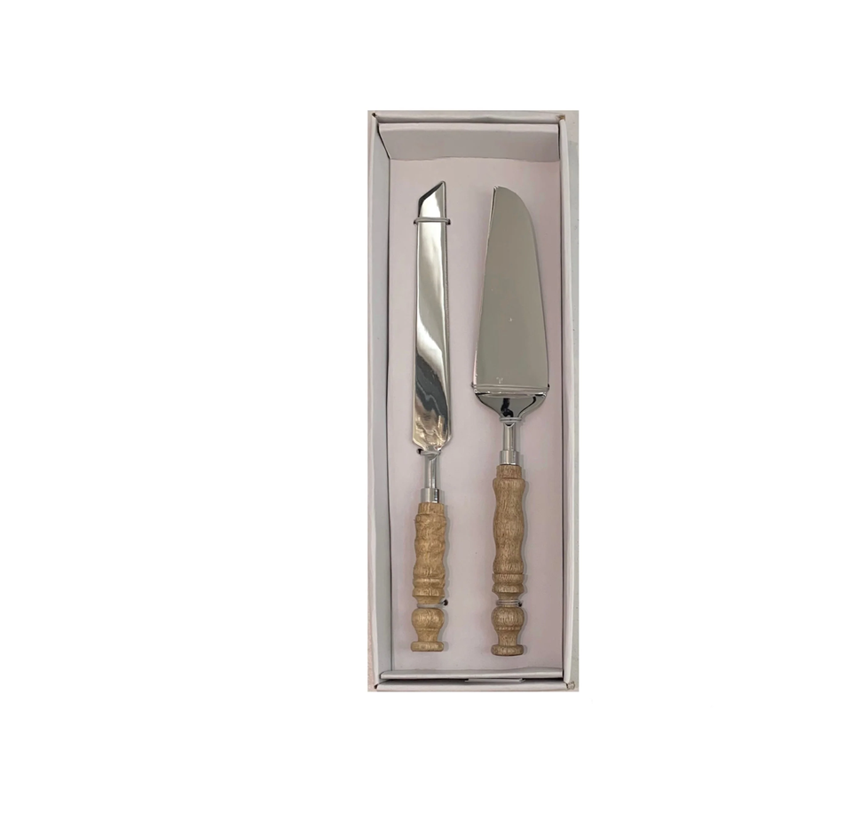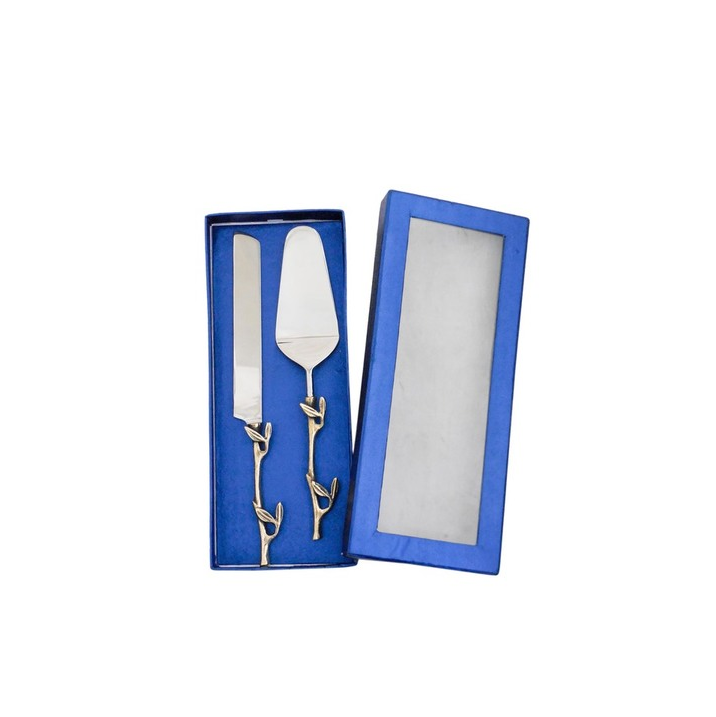 Juego de servidor de pastel dorado de acero inoxidable con cortador de pastel con mango y servidor con caja azul de embalaje con mango