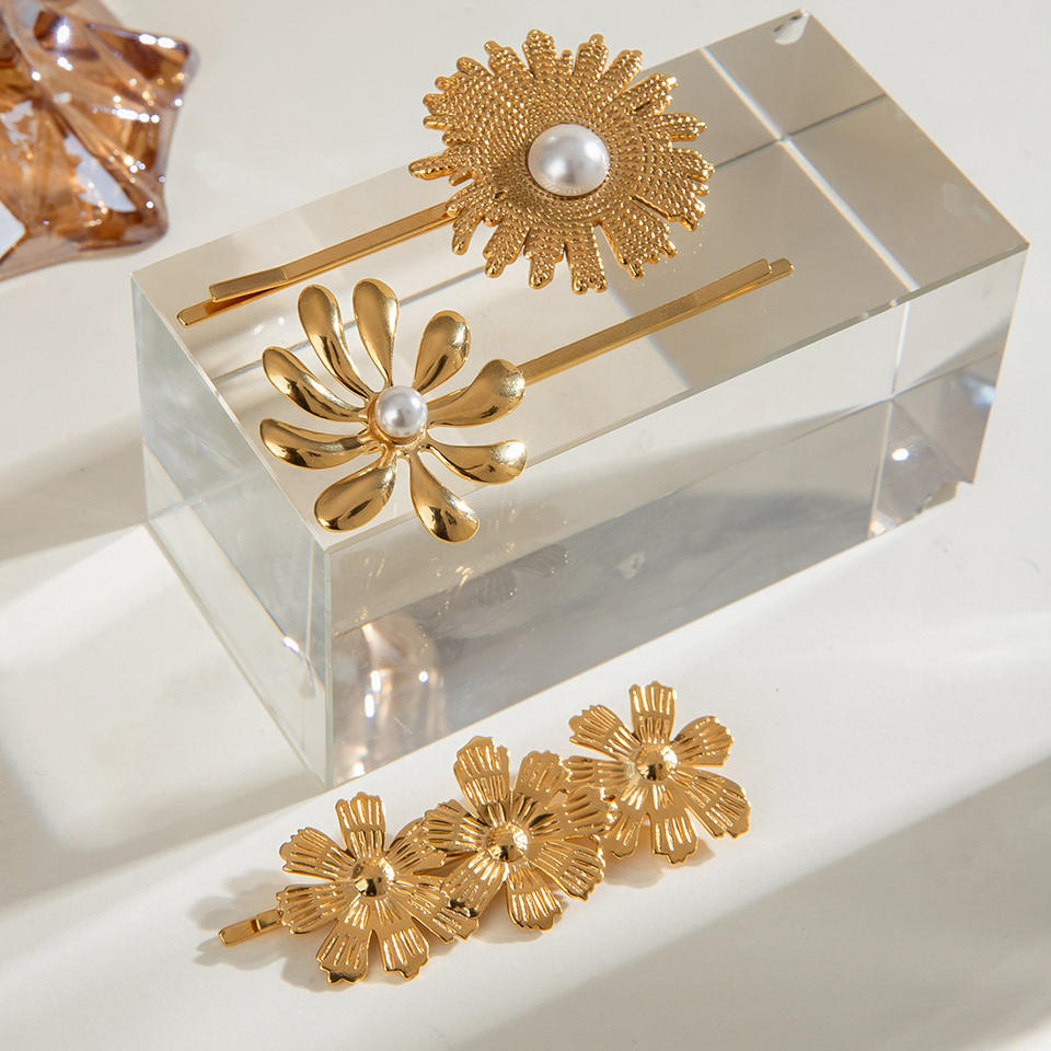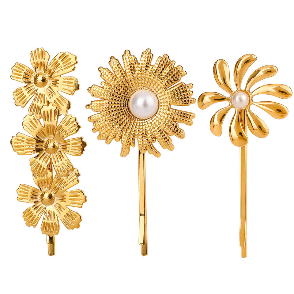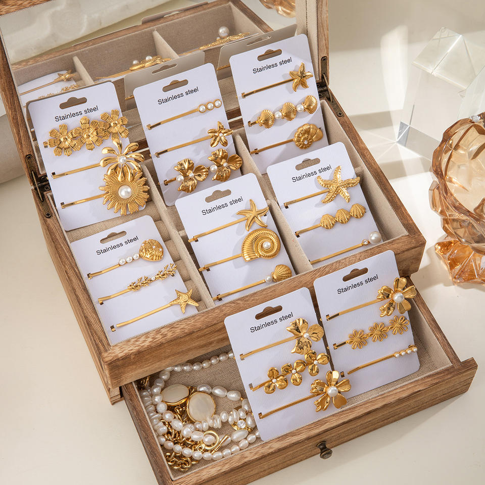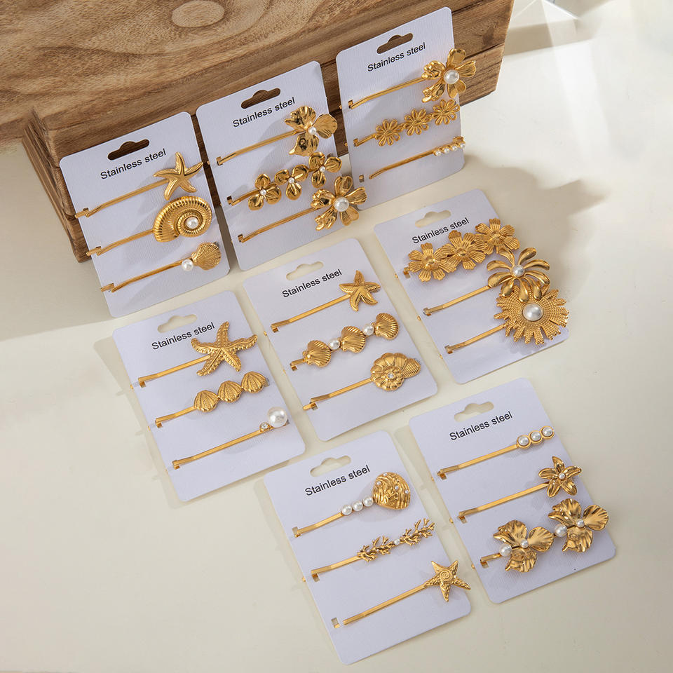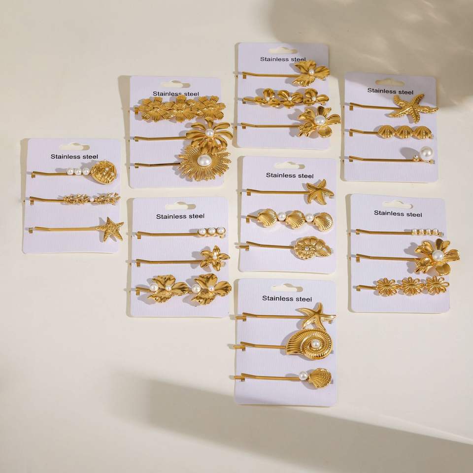 Juego de Pinzas para el Cabello de Acero Inoxidable, con Diseño de Perlas Doradas, Flores, Conchas y Estrellas, Temática Oceánica, para Uso Diario, Accesorios para el Cabello