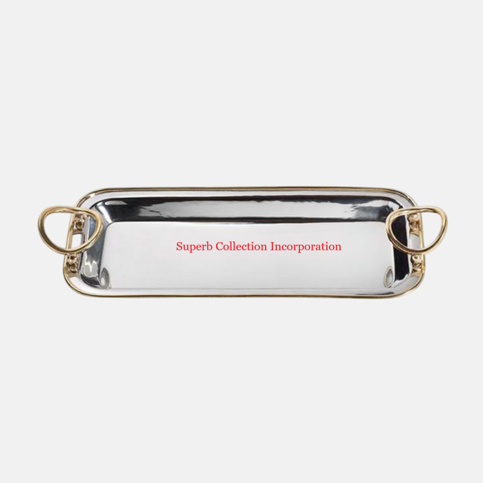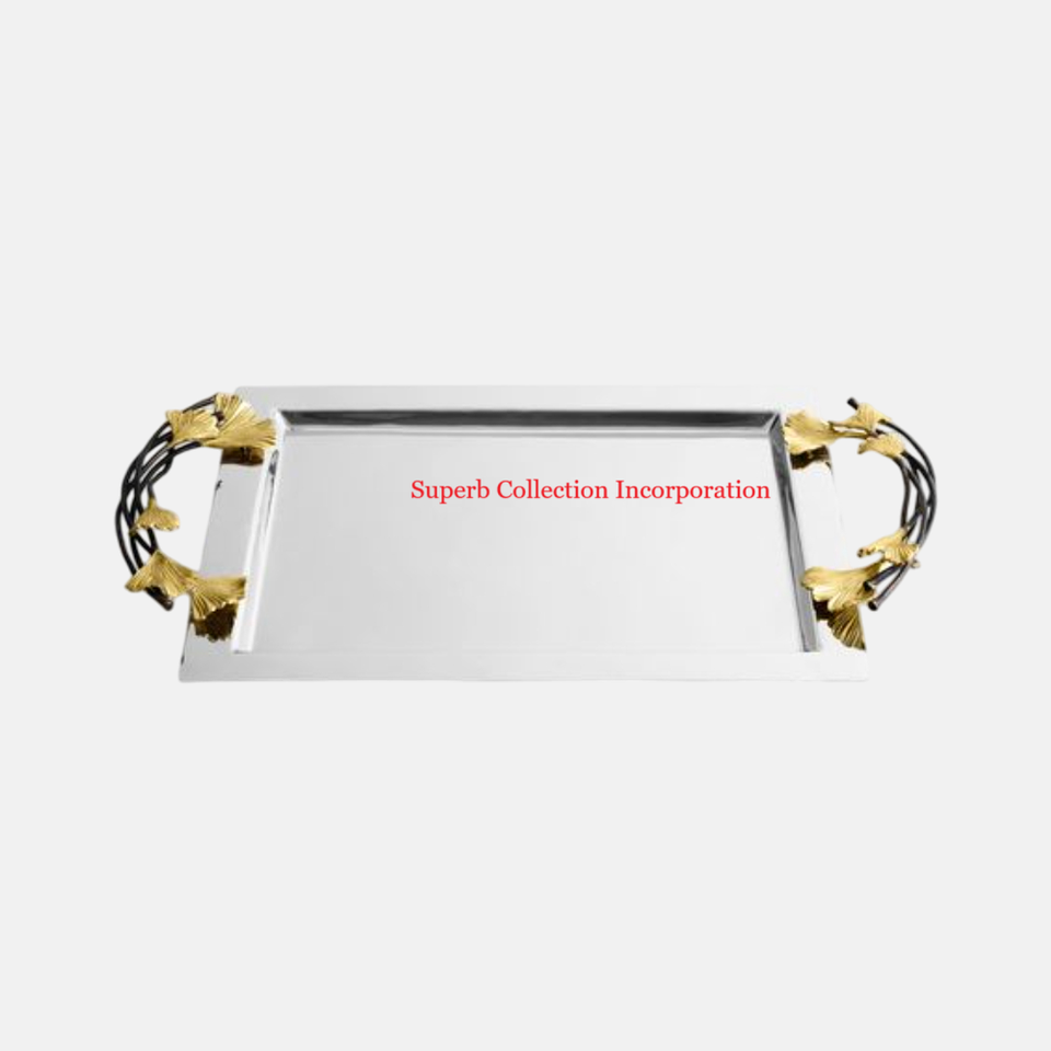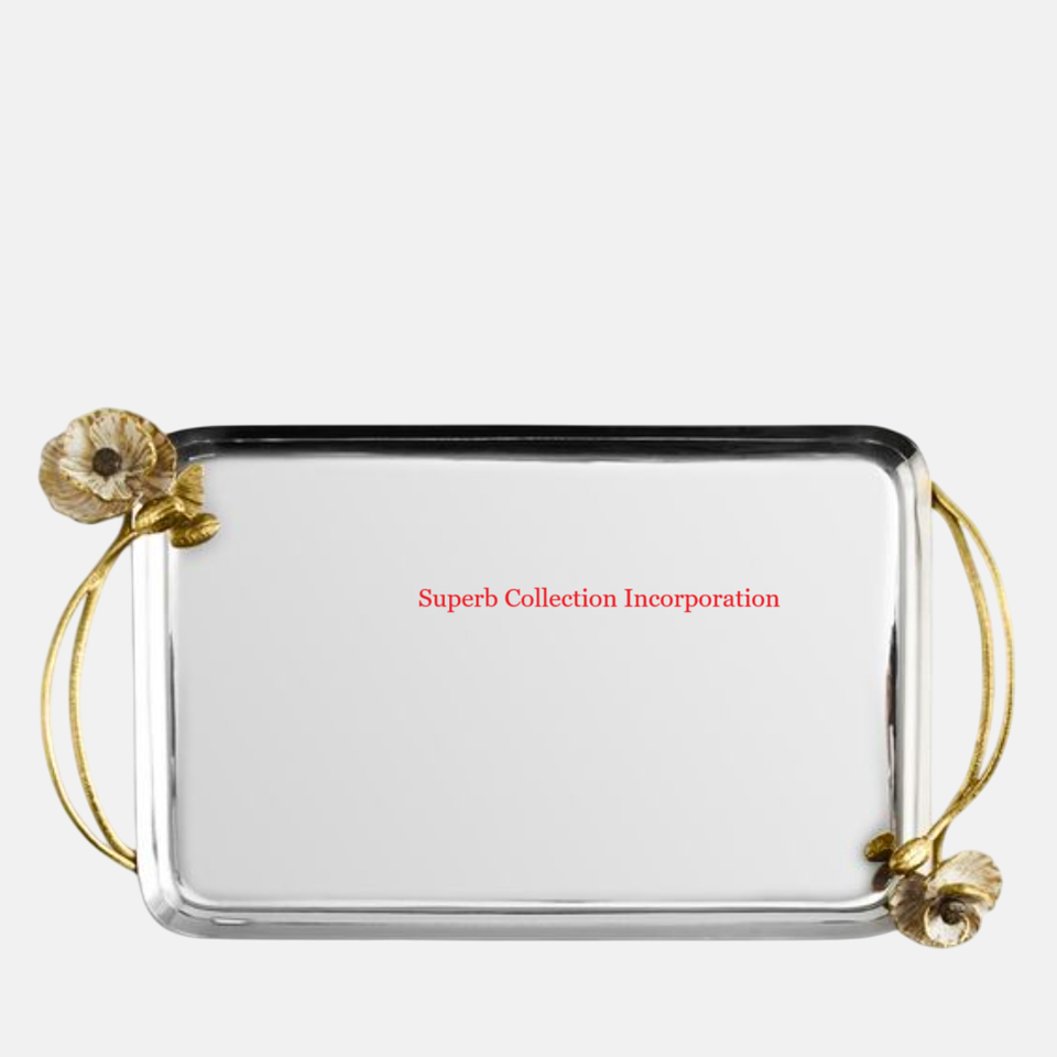 Bandeja rectangular de diseño martillado de acero inoxidable con acento dorado floral para aperitivos y comida, platos y platos de venta superior