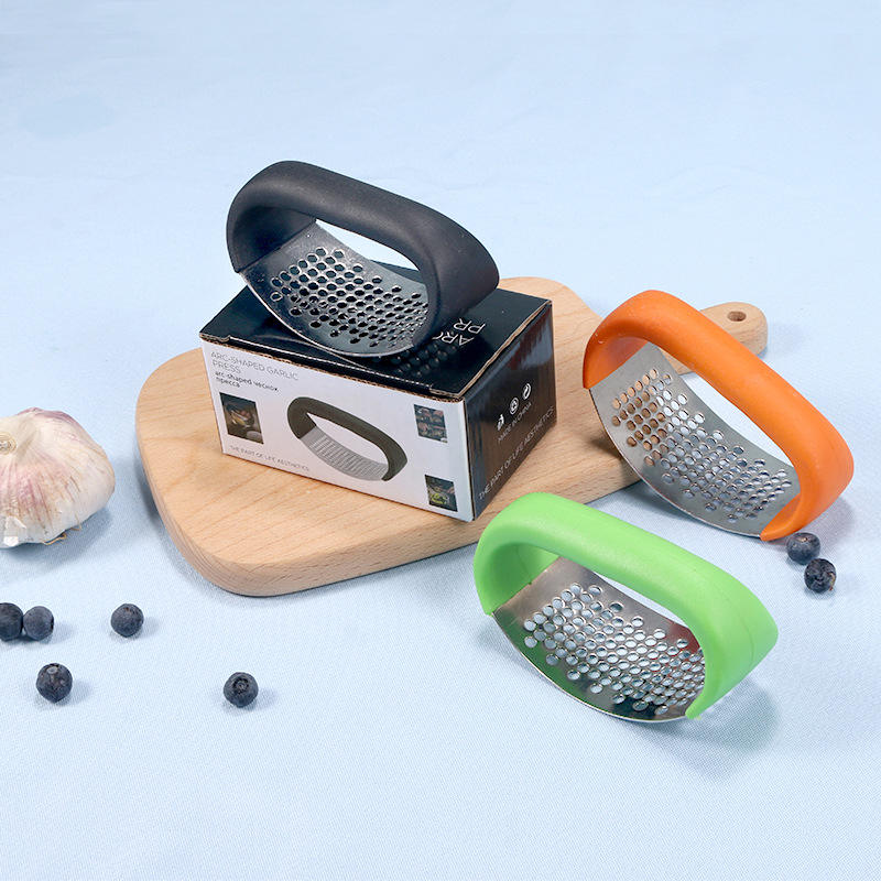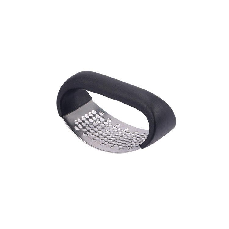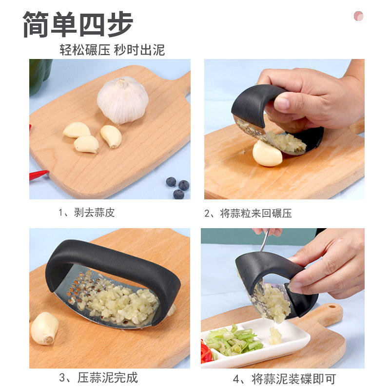 Prensa de ajo manual de acero inoxidable, picadora y peladora con mango negro para uso en la cocina