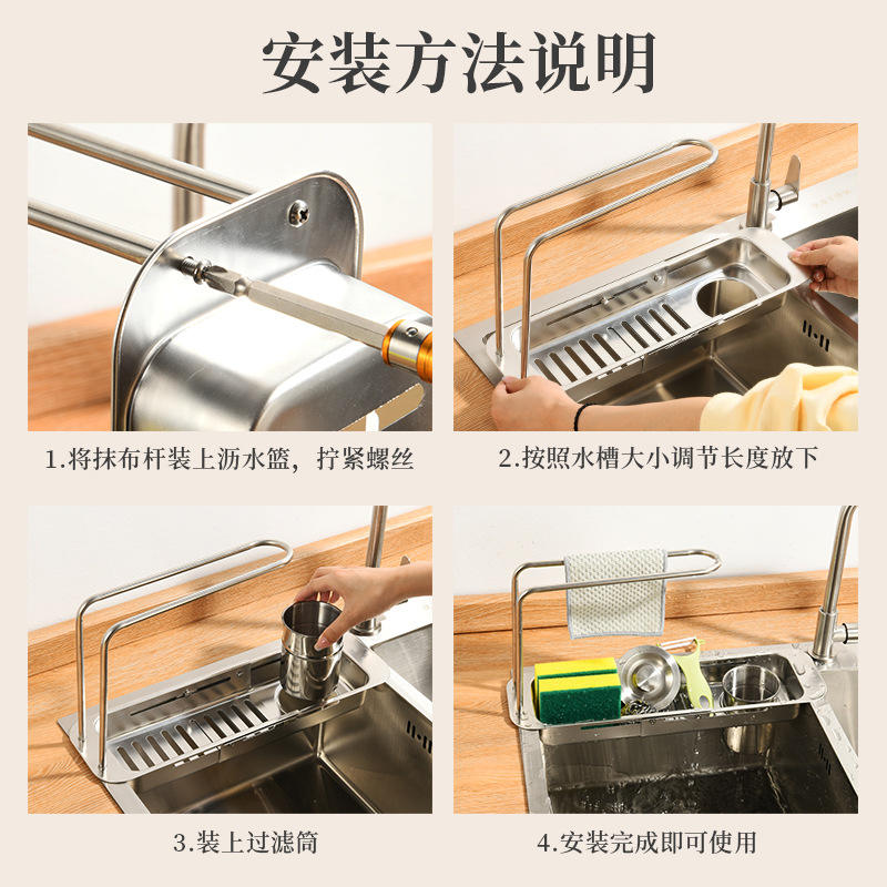 Escurridor de fregadero de cocina de acero inoxidable con bandeja colgante para paños de cocina, esponjas y estropajos de acero