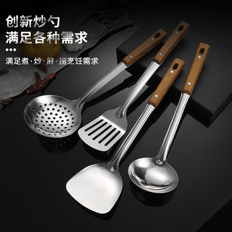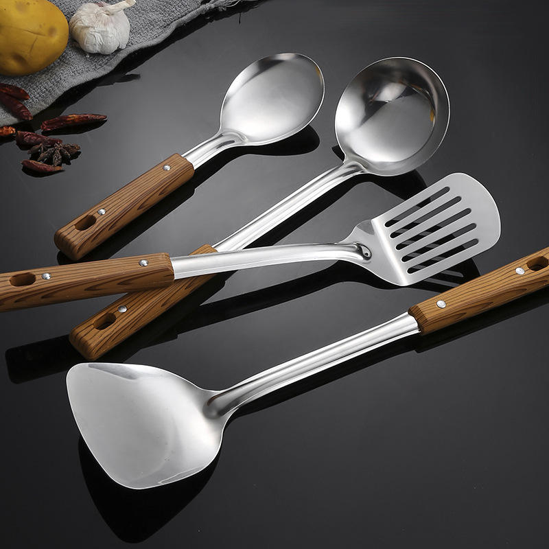 Juego de utensilios de cocina de acero inoxidable, 5 piezas, herramientas de cocina con mango de madera, fáciles de limpiar
