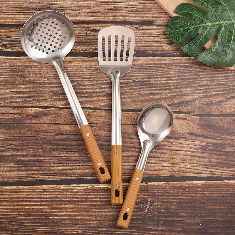 Juego de utensilios de cocina de acero inoxidable con mango de madera, juego de 5 piezas de cucharas, espátulas y cucharones para sartenes antiadherentes