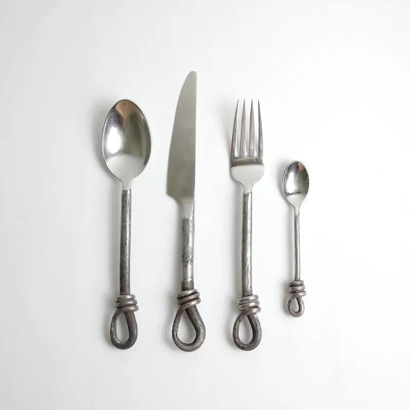 Juego de cubiertos de acero inoxidable Diseño completamente metálico Herramientas de cubiertos plateados Diseño de acabado brillante Juego de cubiertos
