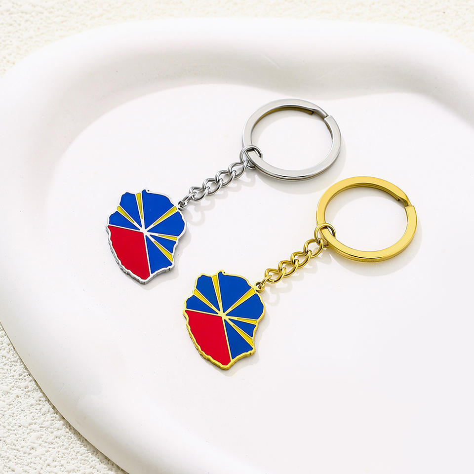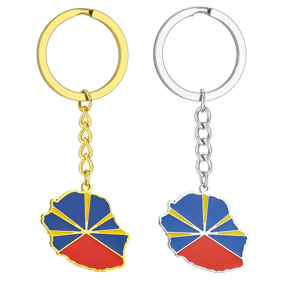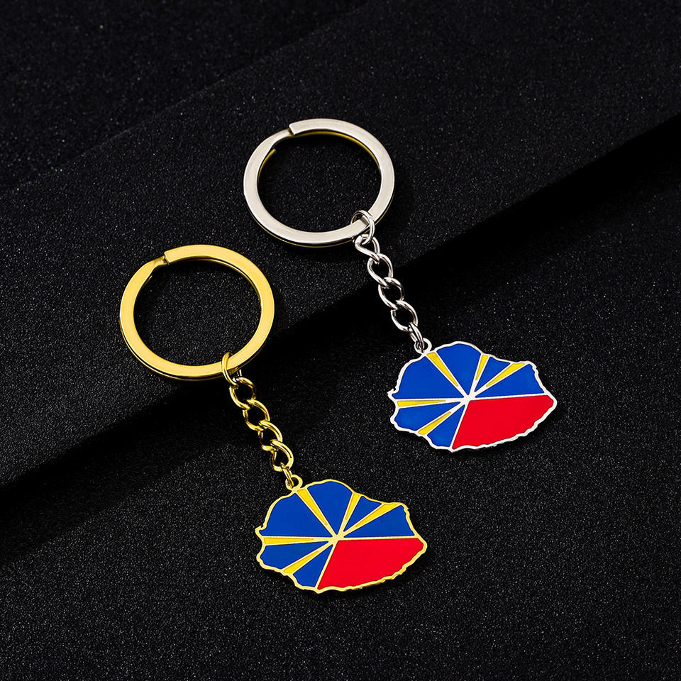 Llavero de acero inoxidable con bandera de La Reunión, llavero con colgante de mapa, esmalte chapado en oro de 18 quilates