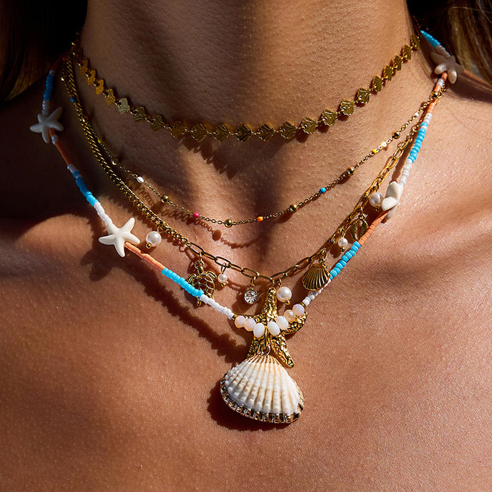 Stainless Steel Seed Bead Shell Pendant Necklace With Starfish Orange Blue Beads Resort Style