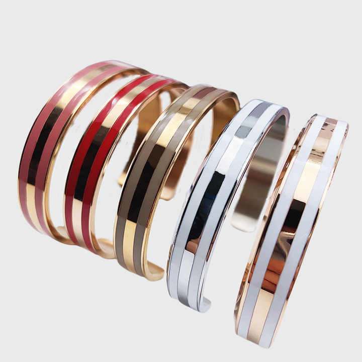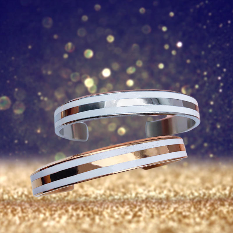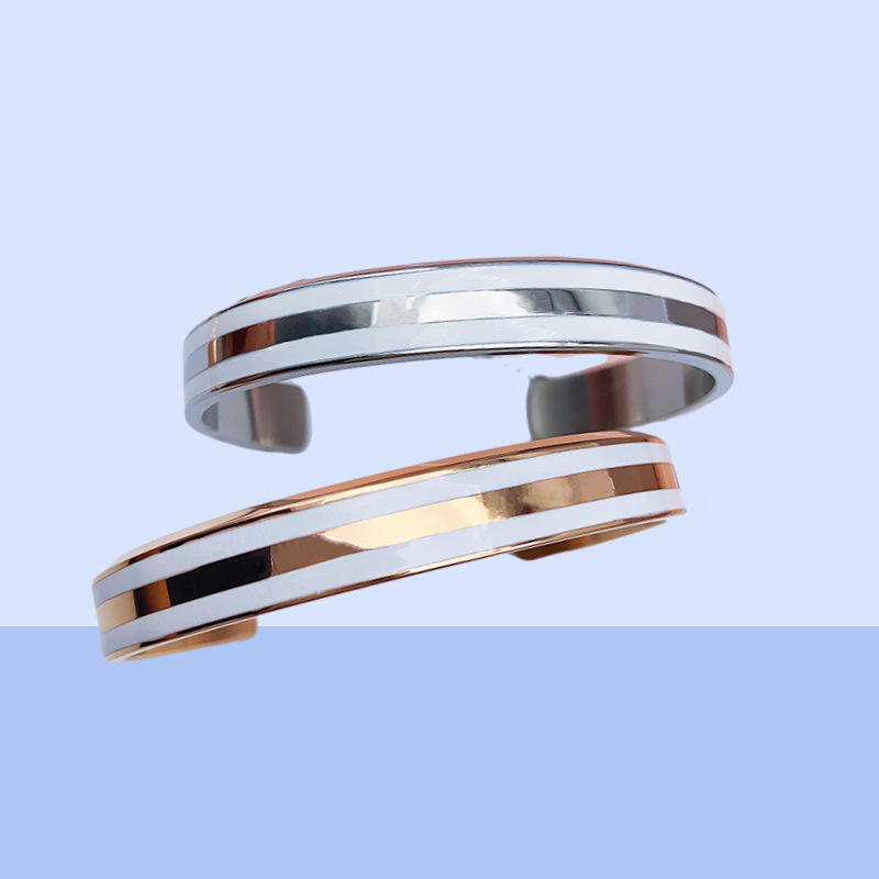 Pulsera de parejas abierta de oro rosa con letras de cerámica versión amplia de acero inoxidable