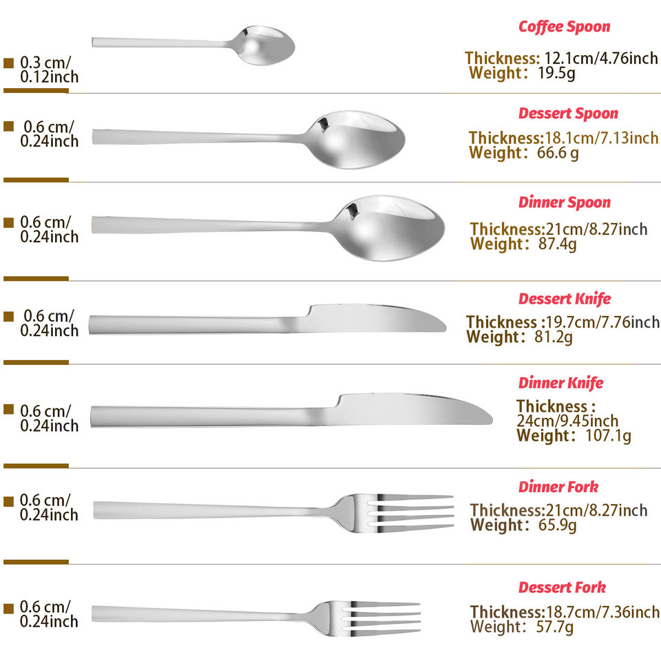 1 juego incluye:1 cuchillo de mesa, 1 cuchara de mesa, 1 tenedor de mesa, 1 cucharilla, 1 tenedor para ensalada