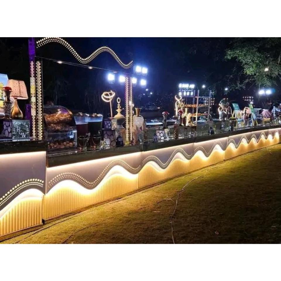Mostrador de buffet de Bodas de acero inoxidable con hojas decorativas impresas para eventos de catering recepciones y configuraciones de banquetes