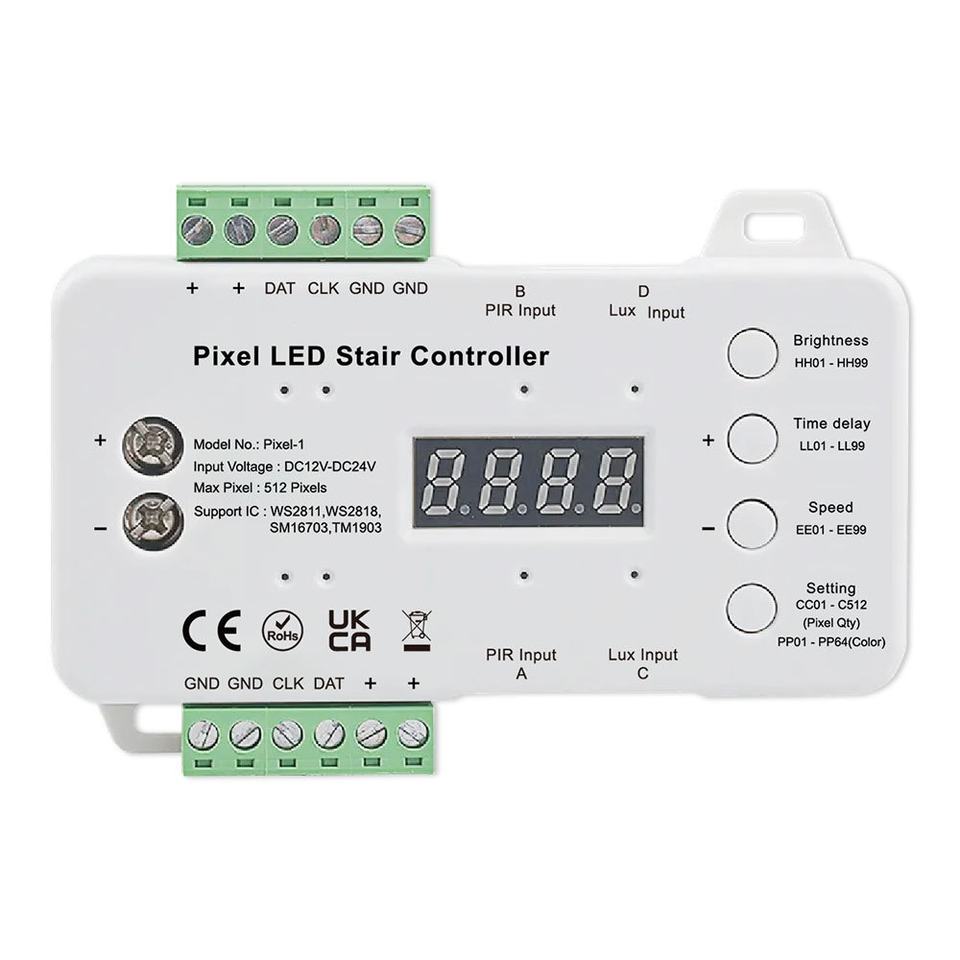 Controlador de tira de luz LED para escaleras con sensor de movimiento, sensor de luz (Lux), temporizador, conexión CC, luz fluida, monocromática, RGB y fantasía