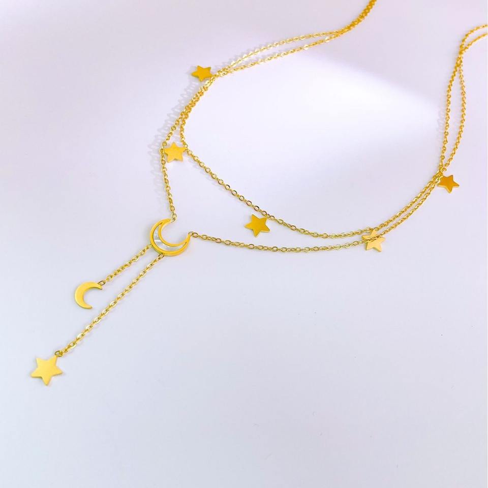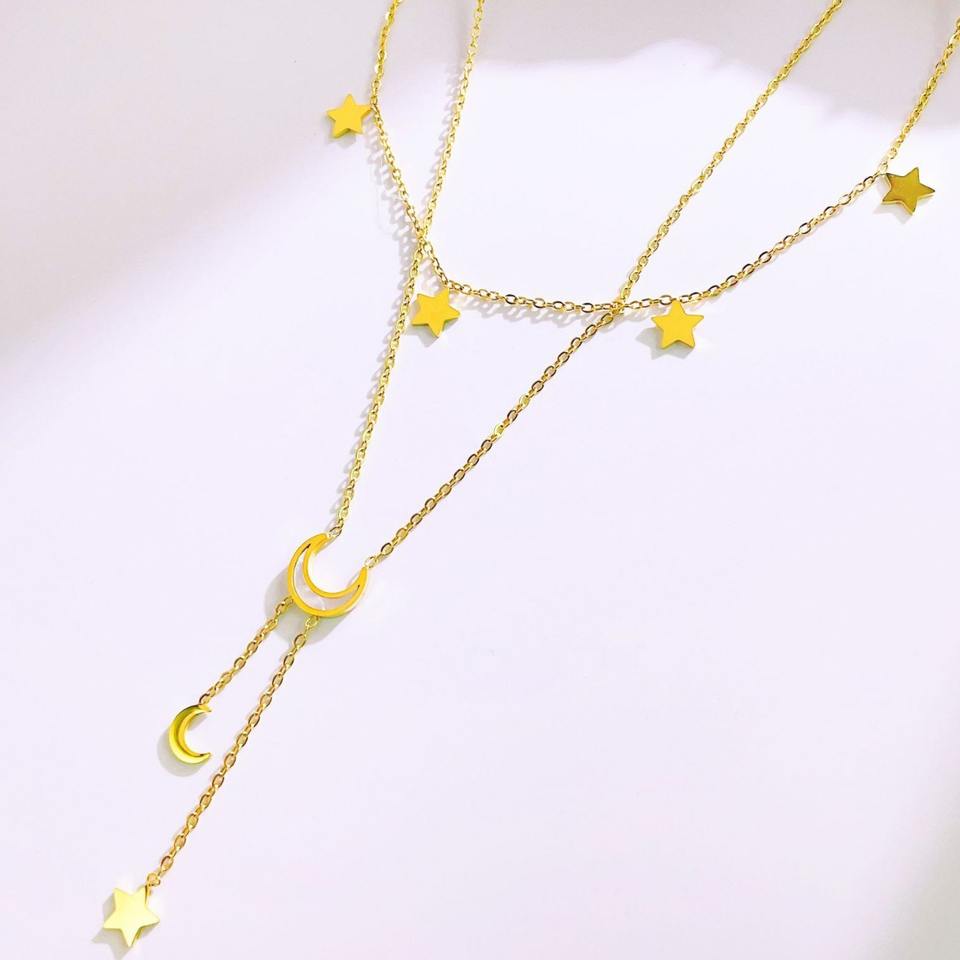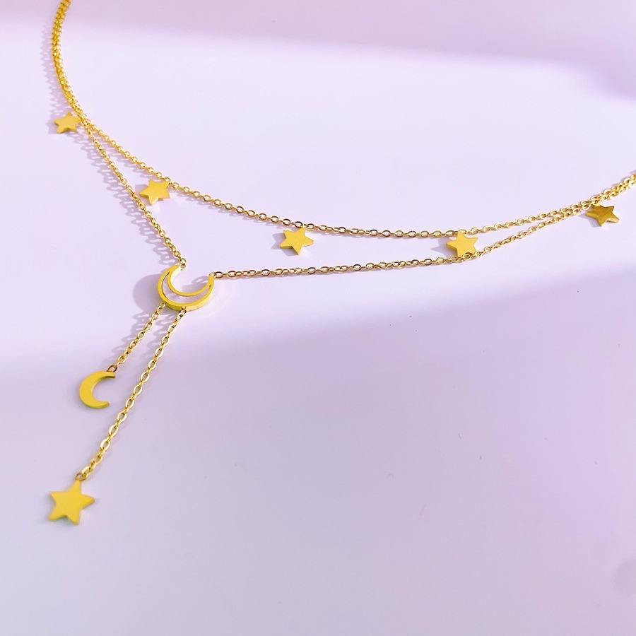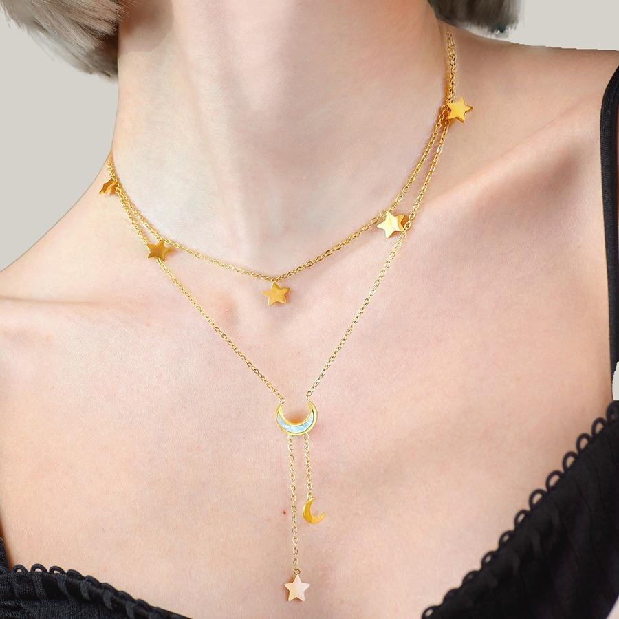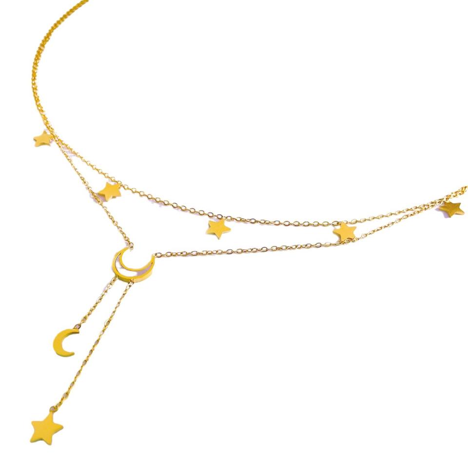 Collar con Colgante de Doble Capa de Estrella y Luna, Chapado en Oro de 18K, Cadena de Eslabones Moderna de Acero Inoxidable para Mujer, Ideal para Regalo