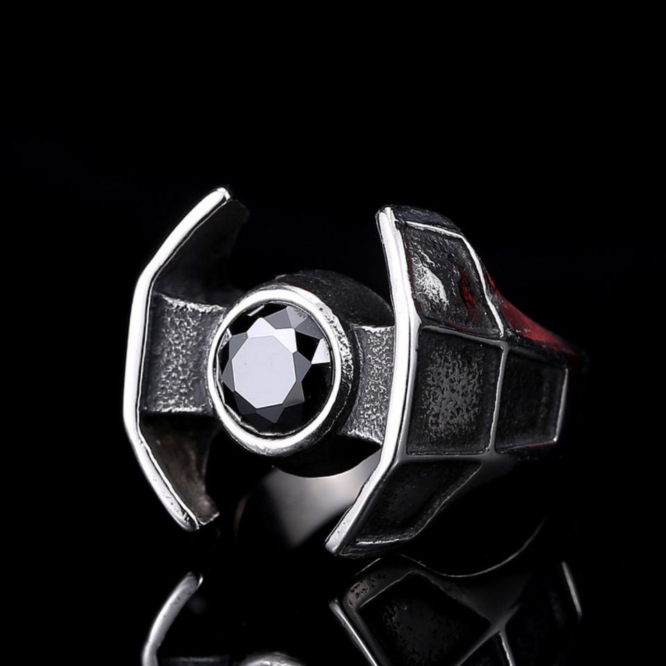 Anillos de acero inoxidable con diseño de nave espacial de Star Wars, venta al por mayor, con esmalte negro, sin piedra, colores personalizados aceptados