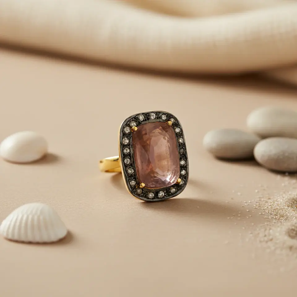 Anillo de Zafiro y Diamantes para Mujer, Oro Amarillo con Baño de Rodio, Piedra Natural con Corte Natural, Acabado en Oro