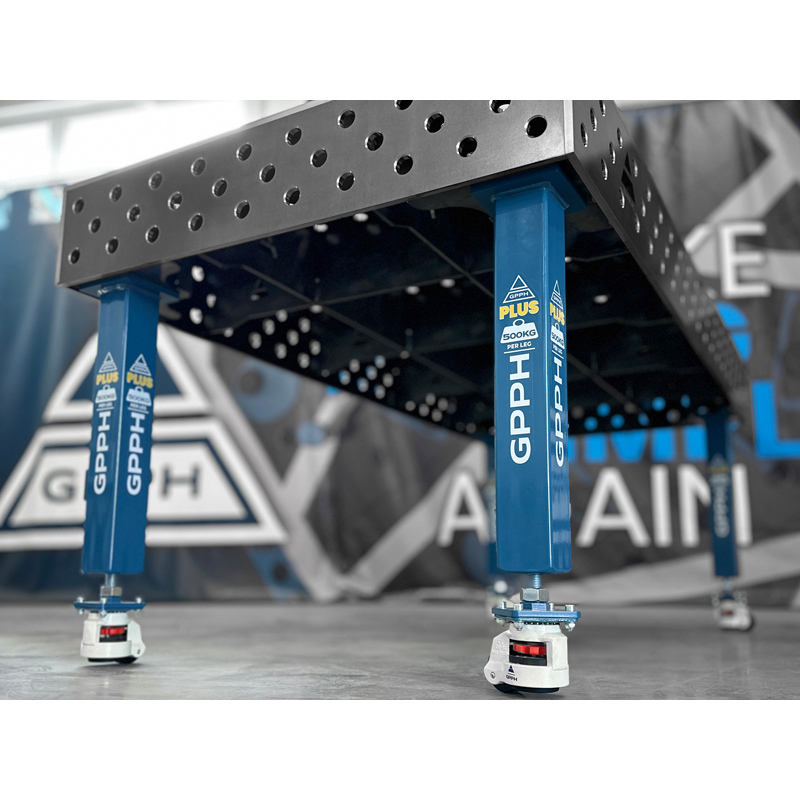 SteelPlus GPPH Banco de soldadura con ruedas de 3x1,48 m, 12mm de espesor, agujeros de 16mm, rejilla de 50x50mm