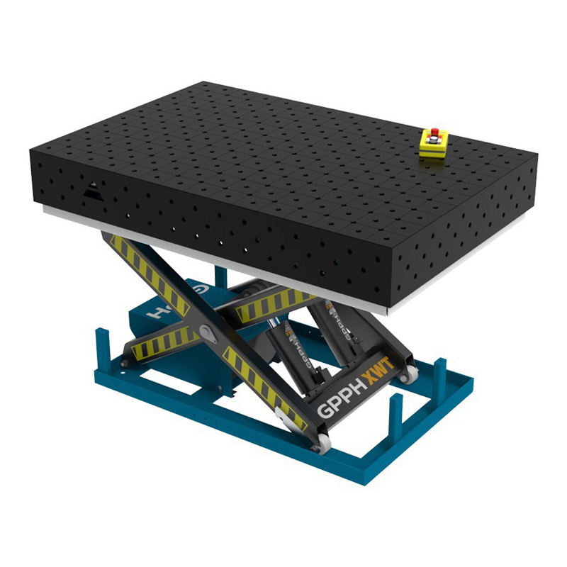 Banco de soldadura hidráulica SteelPlus GPPH 1,5x1Mt 12mm de espesor, rejilla diagonal de 16mm de agujeros