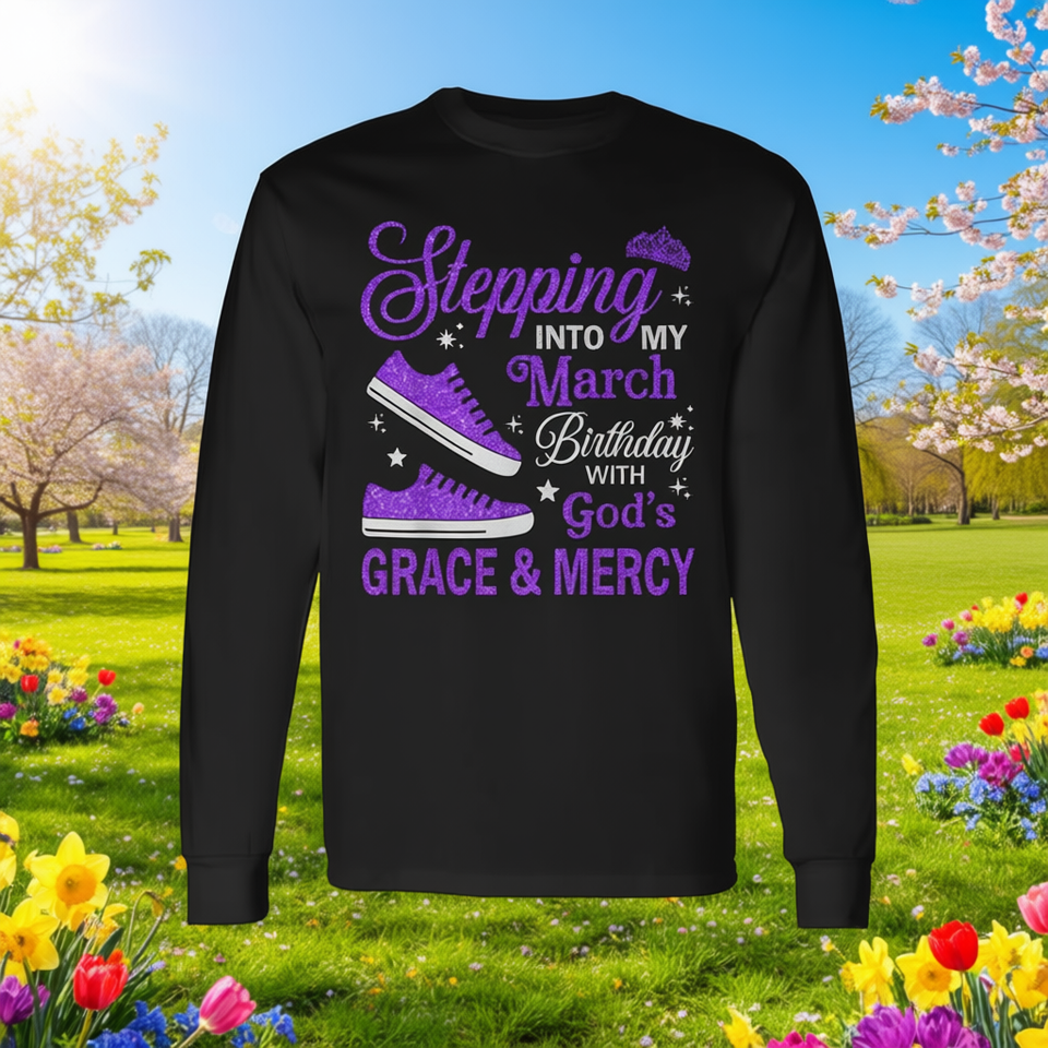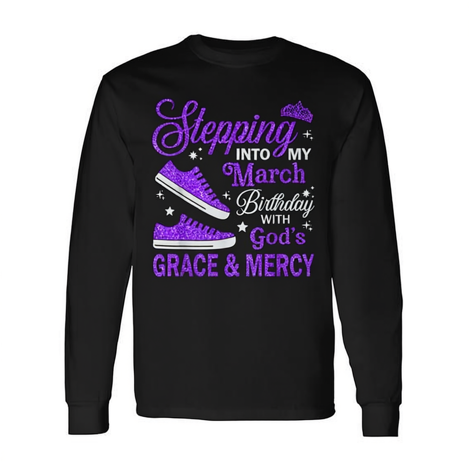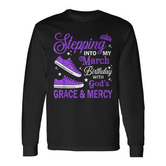 Camiseta de manga larga con estampado de 'Stepping Into My March Birthday With Gods Grace Mercy'