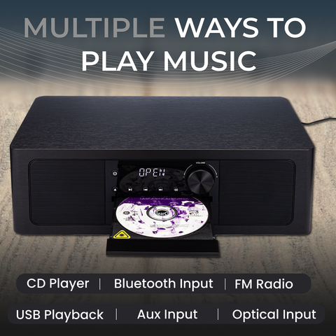 Sistema de Sonido Estéreo con Reproductor de CD, Bluetooth, Radio FM, Reproducción USB, Entrada Auxiliar, Entrada Óptica, Reloj Despertador y Control Remoto