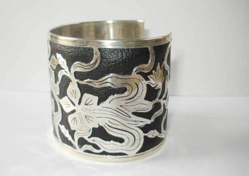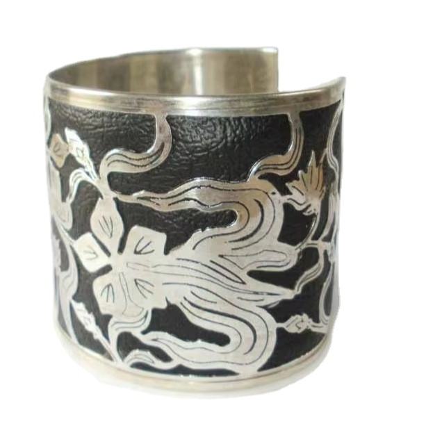 Brazalete Abierto Ajustable de Plata de Ley con Grabado Floral sobre Fondo de Cuero Negro