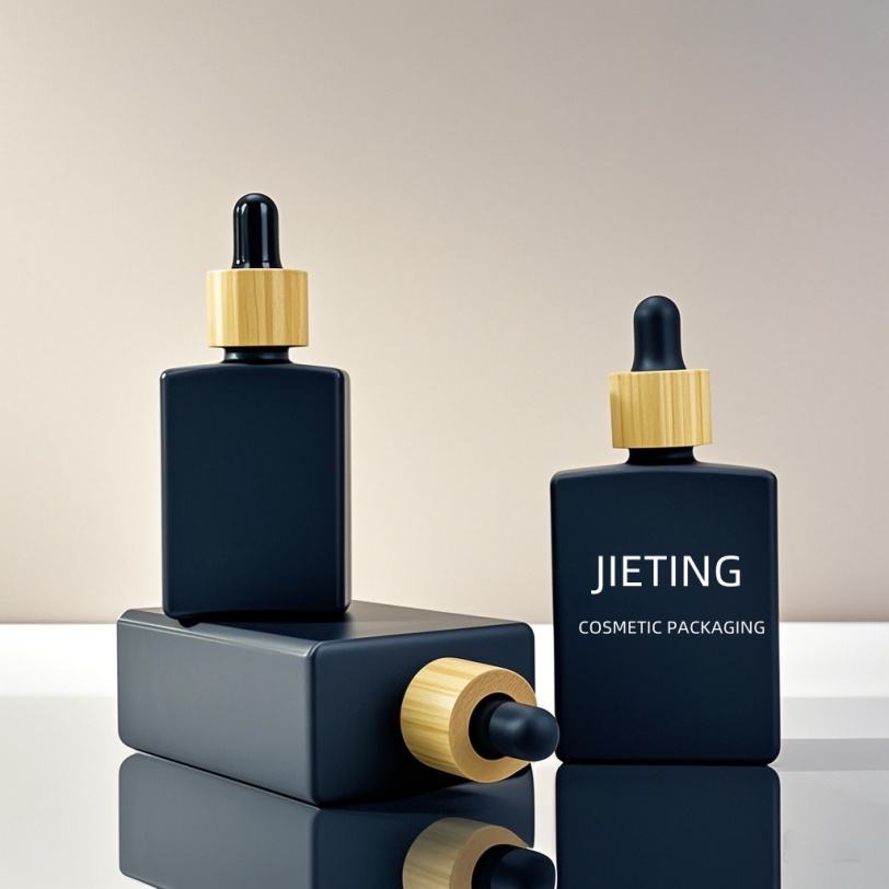 Botella de vidrio esmerilado negro rectangular de 50 ml con hombro plano y tapa cuentagotas de bambú para aceite esencial de barba, cuadrada y vacía.