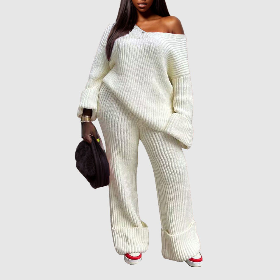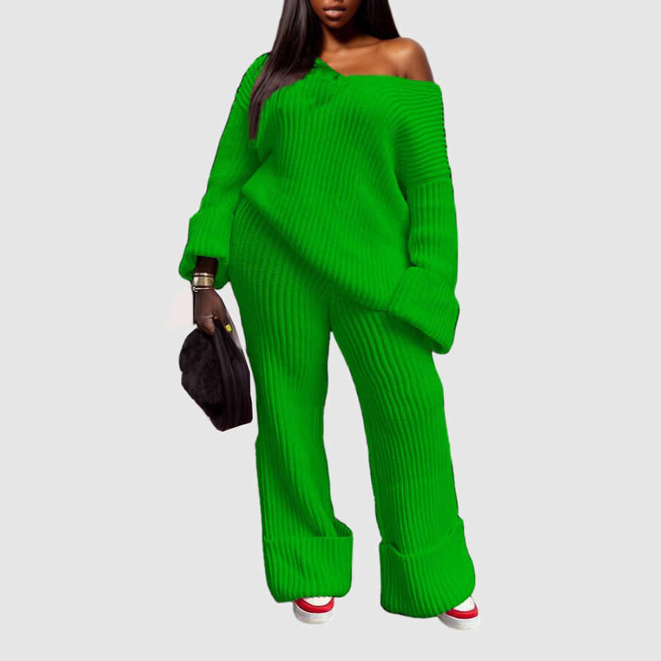 Conjunto de Dos Piezas de Pantalones y Top de Punto de Color Sólido con Cuello en V, Holgado, para Mujer, Disponible en Stock