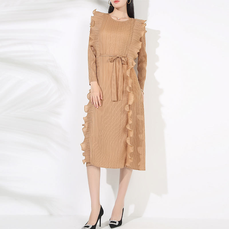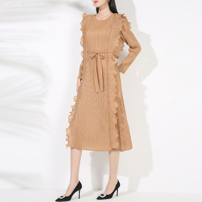Envío Rápido, Alta Calidad, Diseño Ecológico de Moda Otoñal, Vestido Casual para Mujer con Pliegues, Largo hasta la Rodilla, Manga Larga y Cintura Elástica