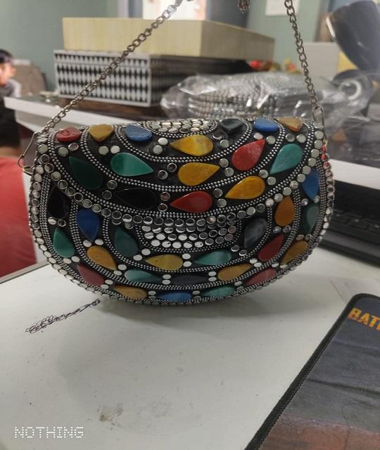 Embrague de piedra Diseño de lujo Bolsos hechos a mano Diseñador de noche de plata Listo para enviar Sa Mosaico de latón de resina con metal