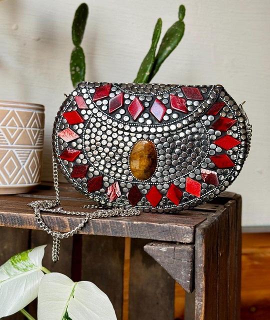 Embrague de piedra Diseño de lujo Bolsos hechos a mano Diseñador de noche de plata Listo para enviar Sa Mosaico de latón de resina con metal